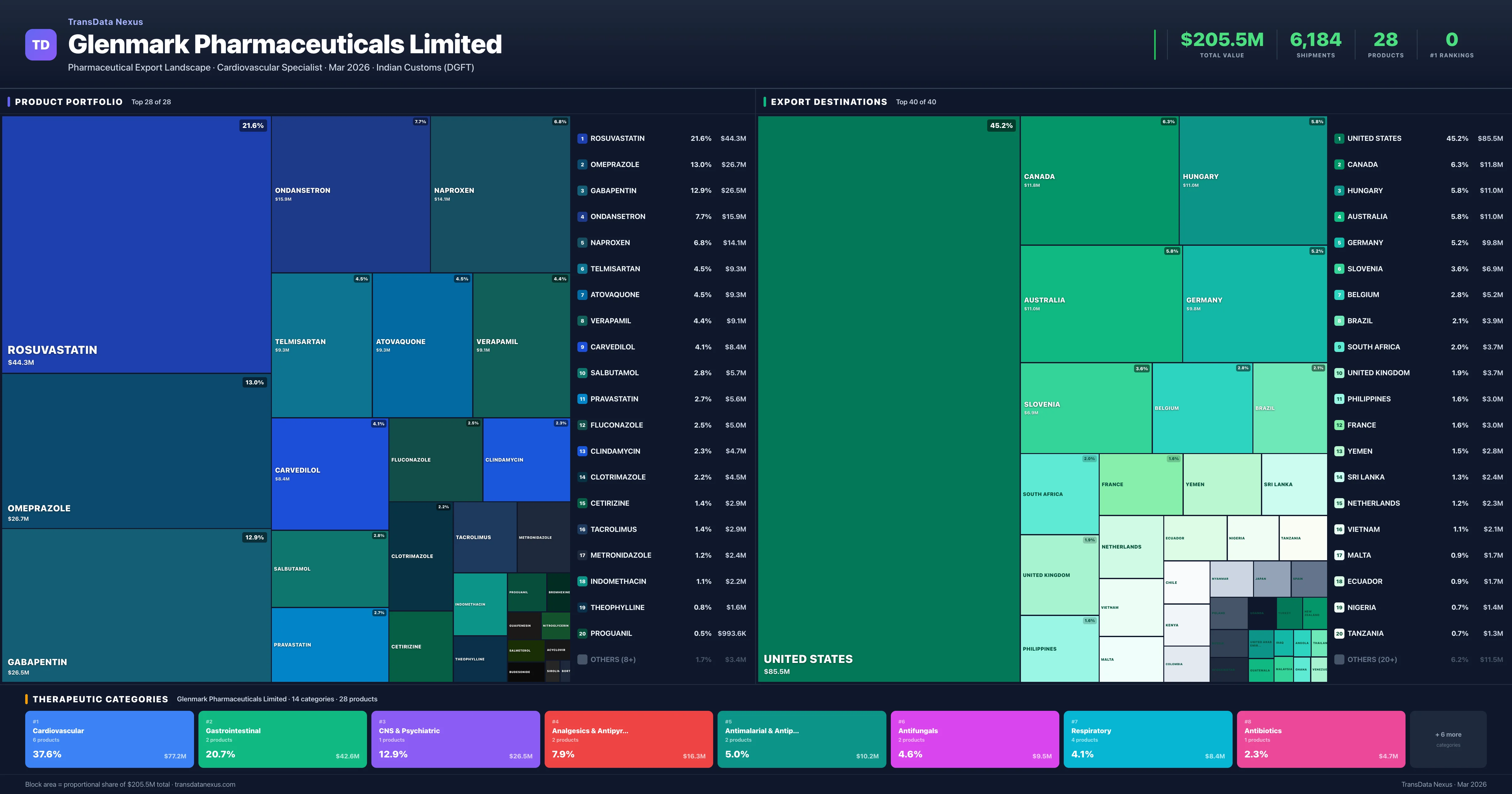 Glenmark Pharmaceuticals Limited is an Indian pharmaceutical exporter with a total trade value of $205.5M across 28 products in 14 therapeutic categories. Based on 6,184 verified export shipments from Indian Customs (DGFT) records, the company actively competes across multiple product segments. Top exports include Rosuvastatin ($44.3M), Omeprazole ($26.7M), Gabapentin ($26.5M).