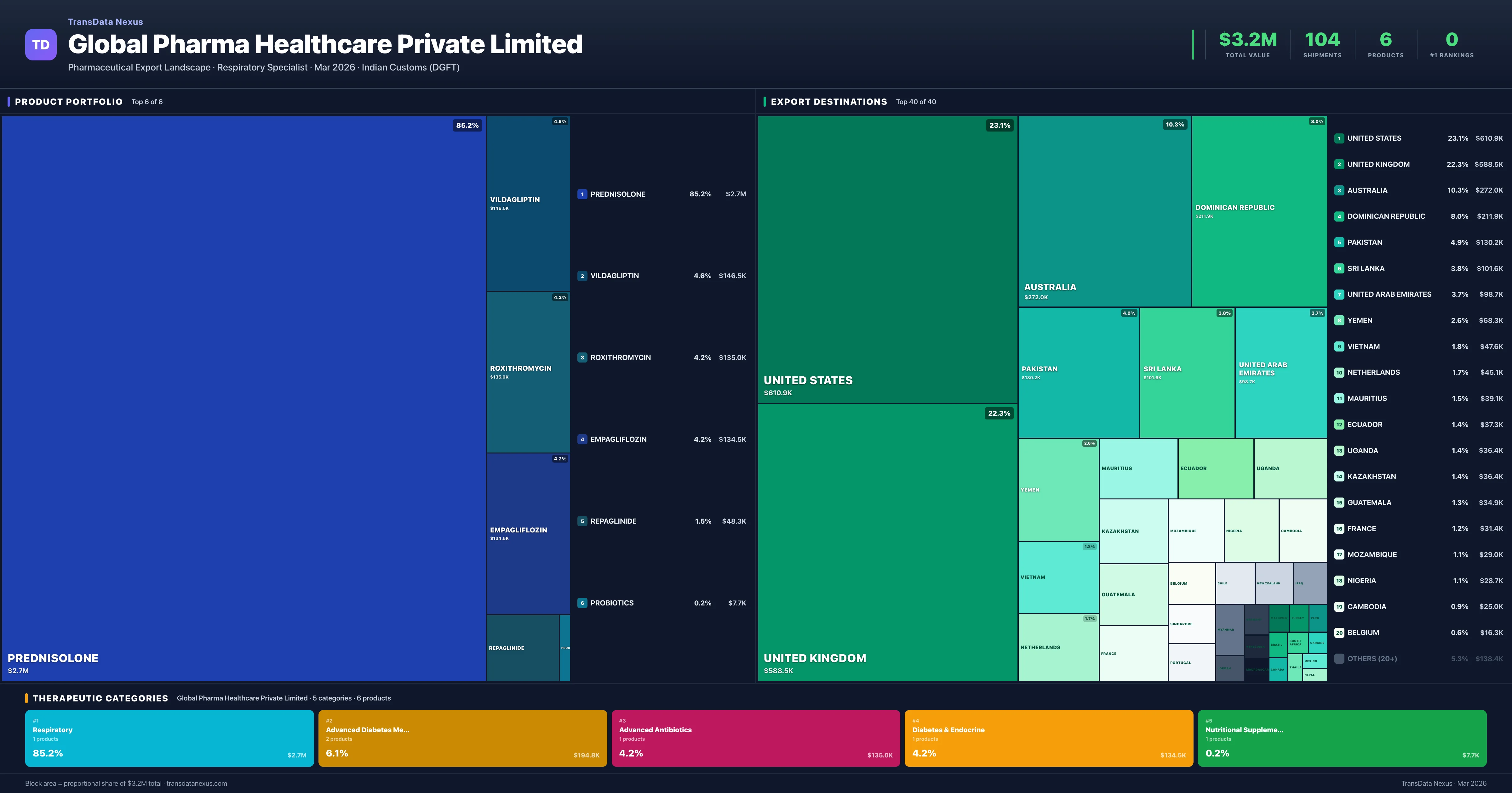Global Pharma Healthcare Private Limited's total pharmaceutical export value is $3.2M, based on 104 verified shipments recorded in Indian Customs (DGFT) data.