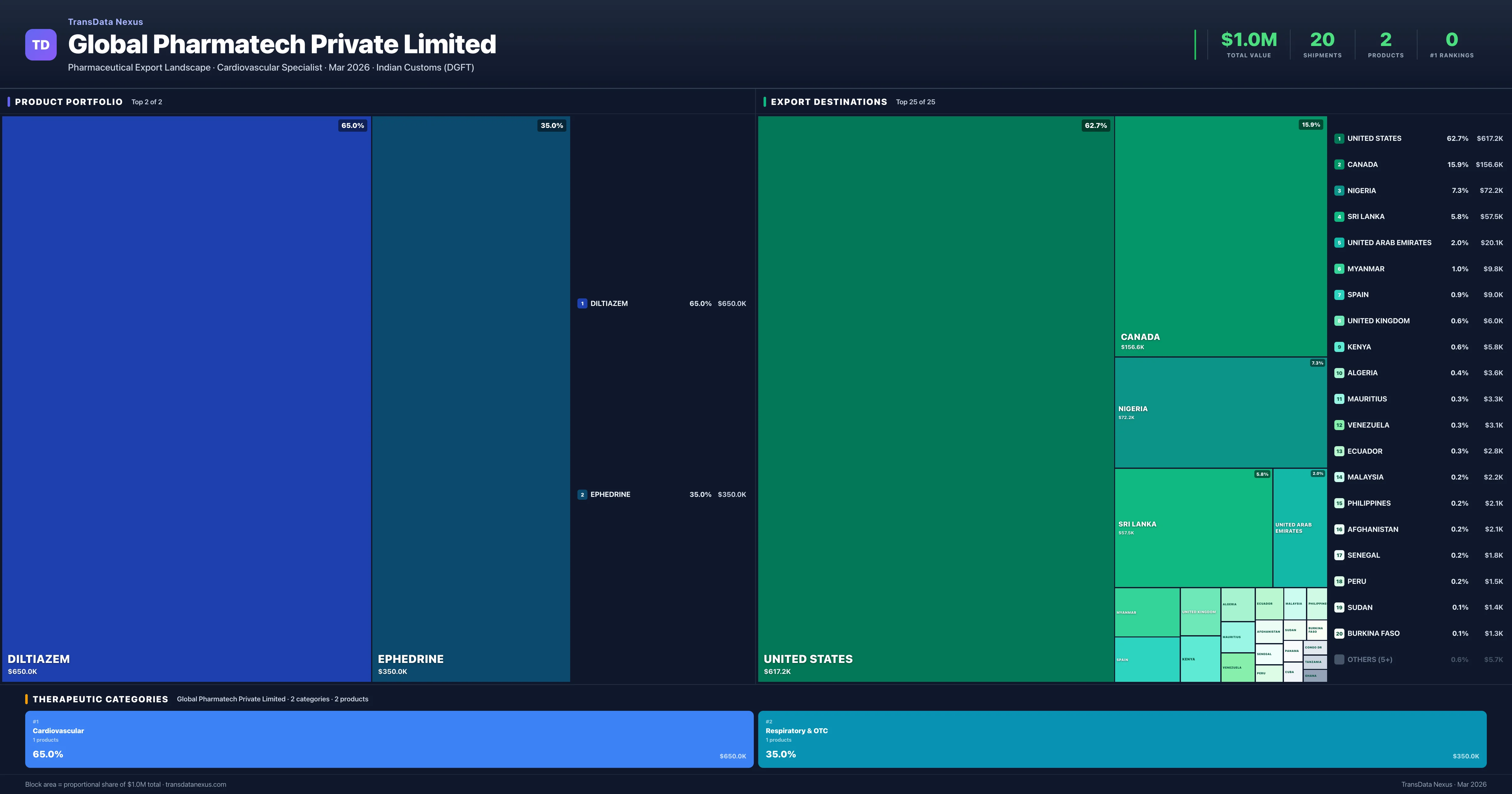 Global Pharmatech Private Limited is an Indian pharmaceutical exporter with a total trade value of $1.0M across 2 products in 2 therapeutic categories. Based on 20 verified export shipments from Indian Customs (DGFT) records, the company actively competes across multiple product segments. Top exports include Diltiazem ($650.0K), Ephedrine ($350.0K), .