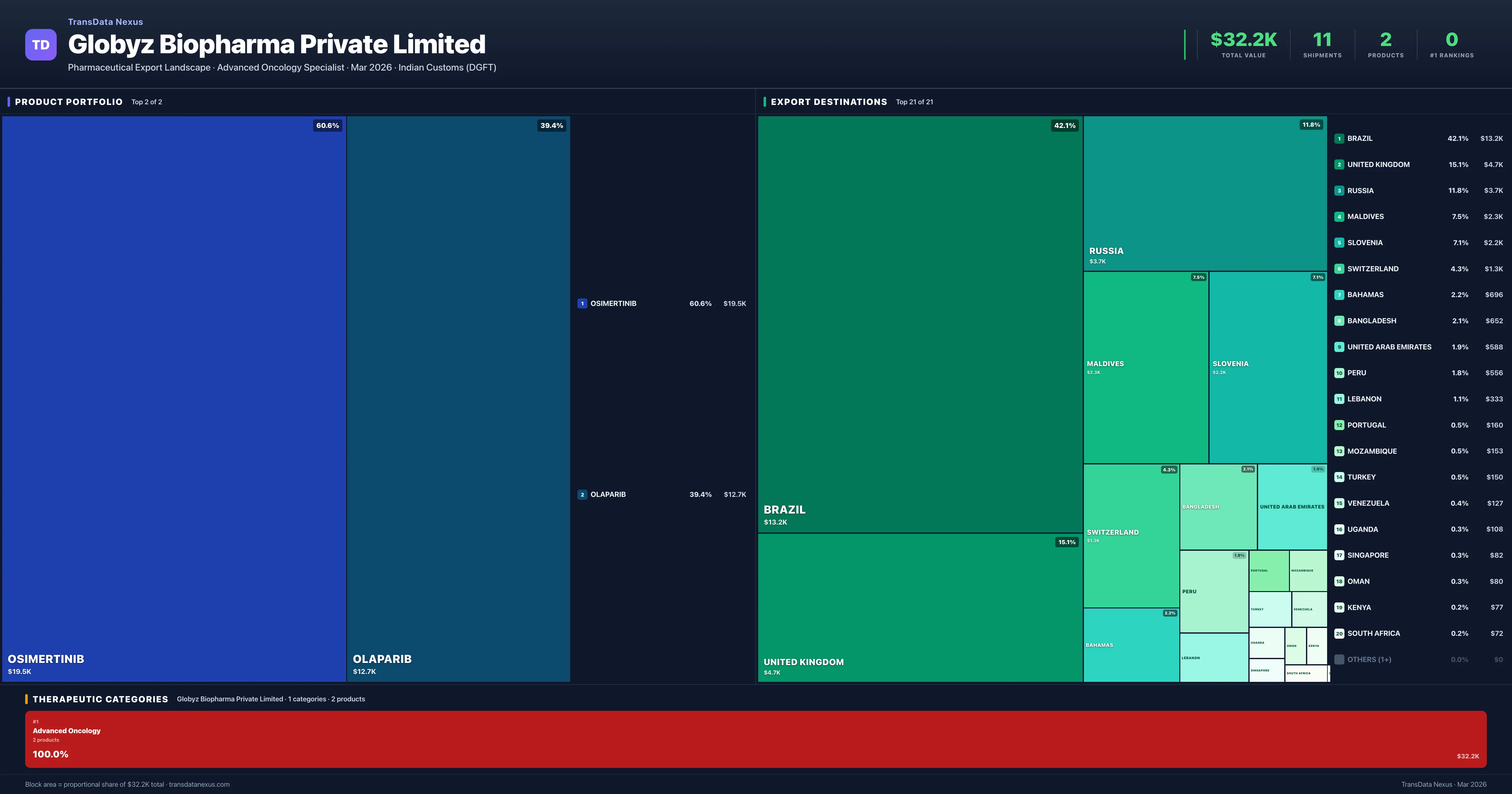 Globyz Biopharma Private Limited is an Indian pharmaceutical exporter with a total trade value of $32.2K across 2 products in 1 therapeutic categories. Based on 11 verified export shipments from Indian Customs (DGFT) records, the company actively competes across multiple product segments. Top exports include Osimertinib ($19.5K), Olaparib ($12.7K), .