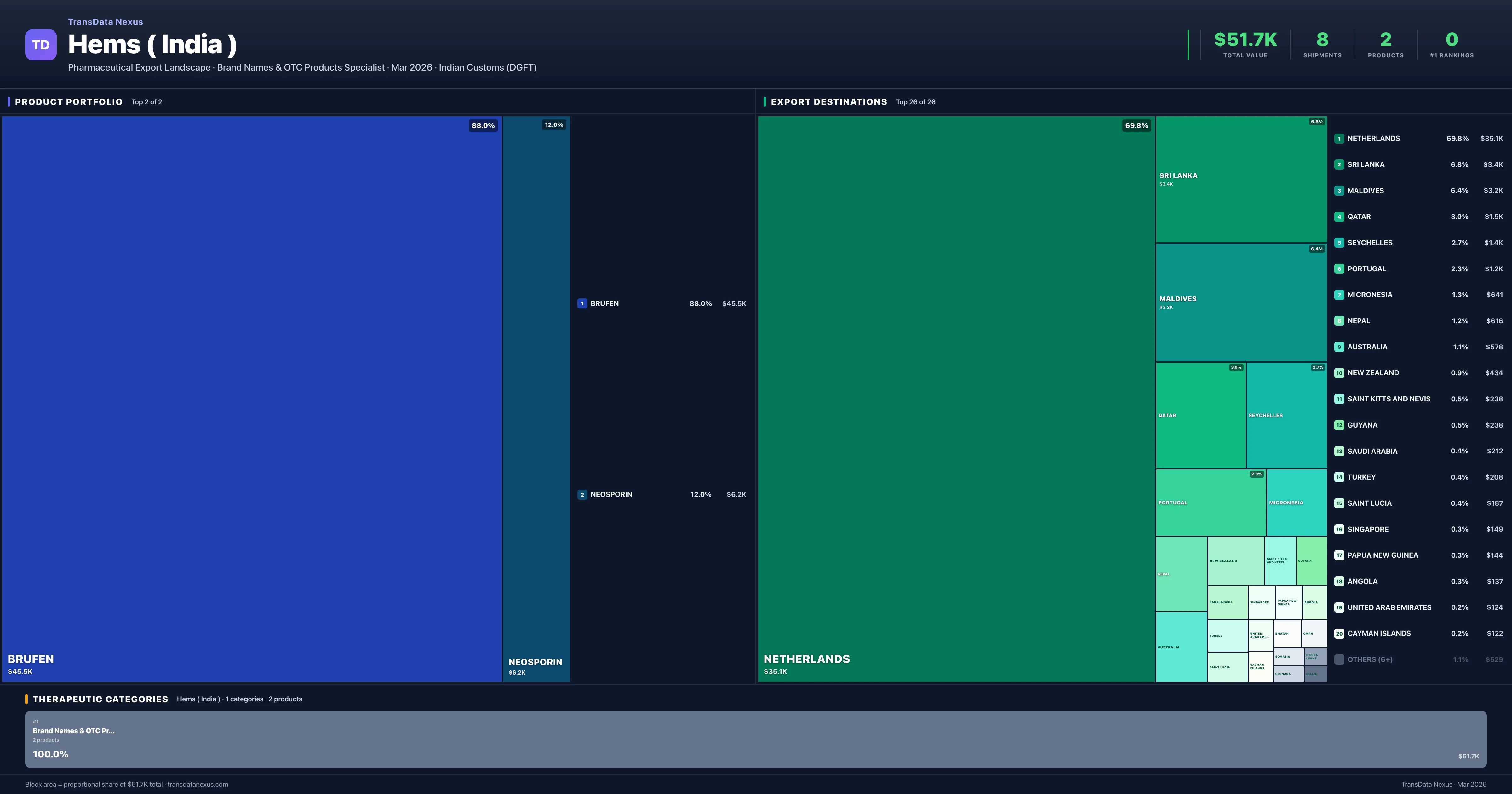 Hems ( India ) is an Indian pharmaceutical exporter with a total trade value of $51.7K across 2 products in 1 therapeutic categories. Based on 8 verified export shipments from Indian Customs (DGFT) records, the company actively competes across multiple product segments. Top exports include Brufen ($45.5K), Neosporin ($6.2K), .