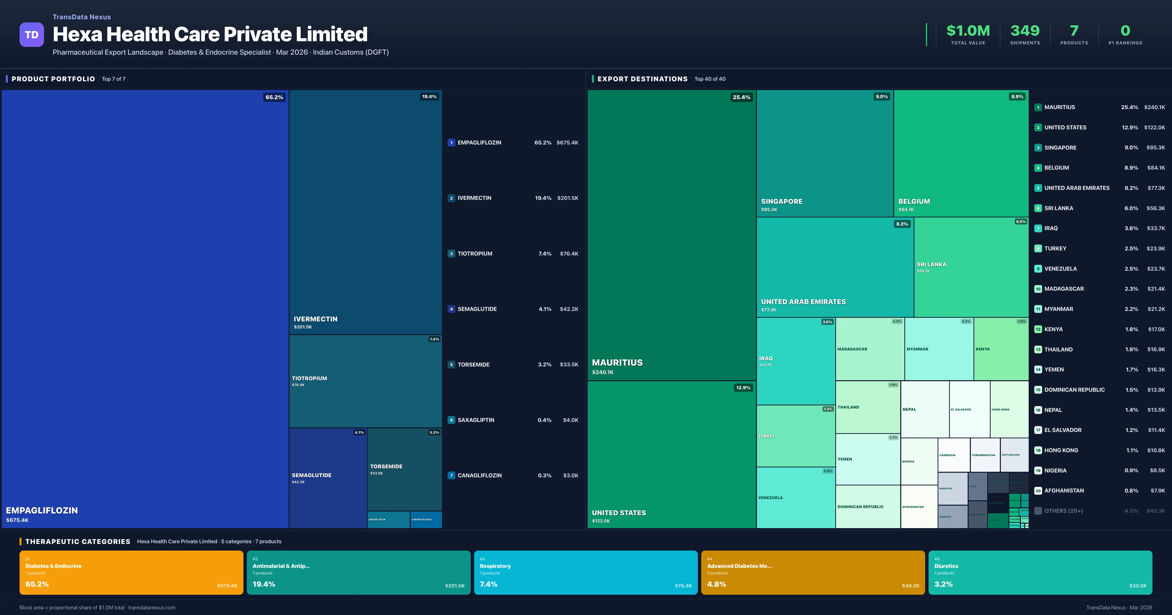 Hexa Health Care Private Limited is an Indian pharmaceutical exporter with a total trade value of $1.0M across 7 products in 5 therapeutic categories. Based on 349 verified export shipments from Indian Customs (DGFT) records, the company actively competes across multiple product segments. Top exports include Empagliflozin ($675.4K), Ivermectin ($201.5K), Tiotropium ($76.4K).