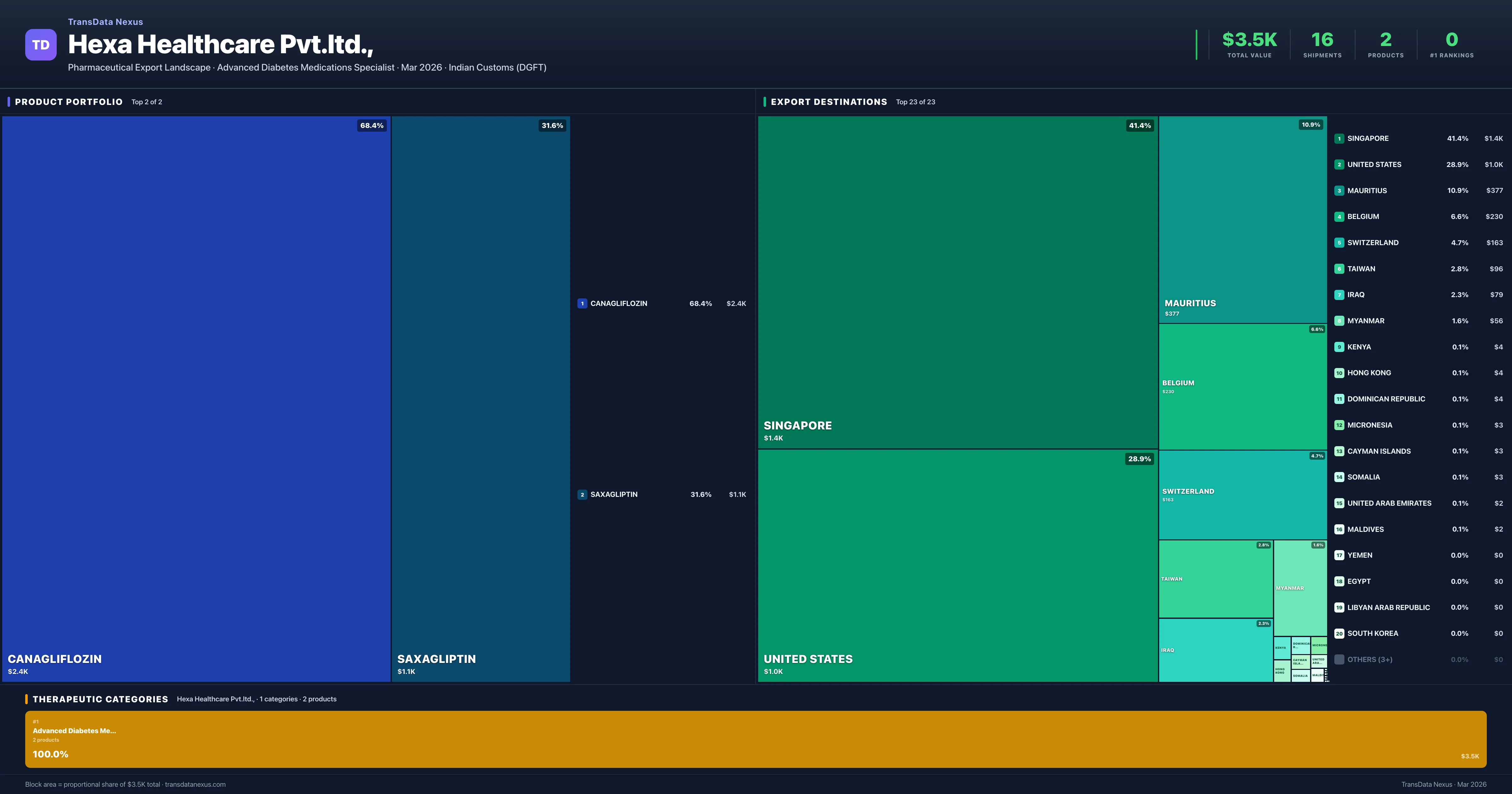 Hexa Healthcare Pvt.ltd., is an Indian pharmaceutical exporter with a total trade value of $3.5K across 2 products in 1 therapeutic categories. Based on 16 verified export shipments from Indian Customs (DGFT) records, the company actively competes across multiple product segments. Top exports include Canagliflozin ($2.4K), Saxagliptin ($1.1K), .
