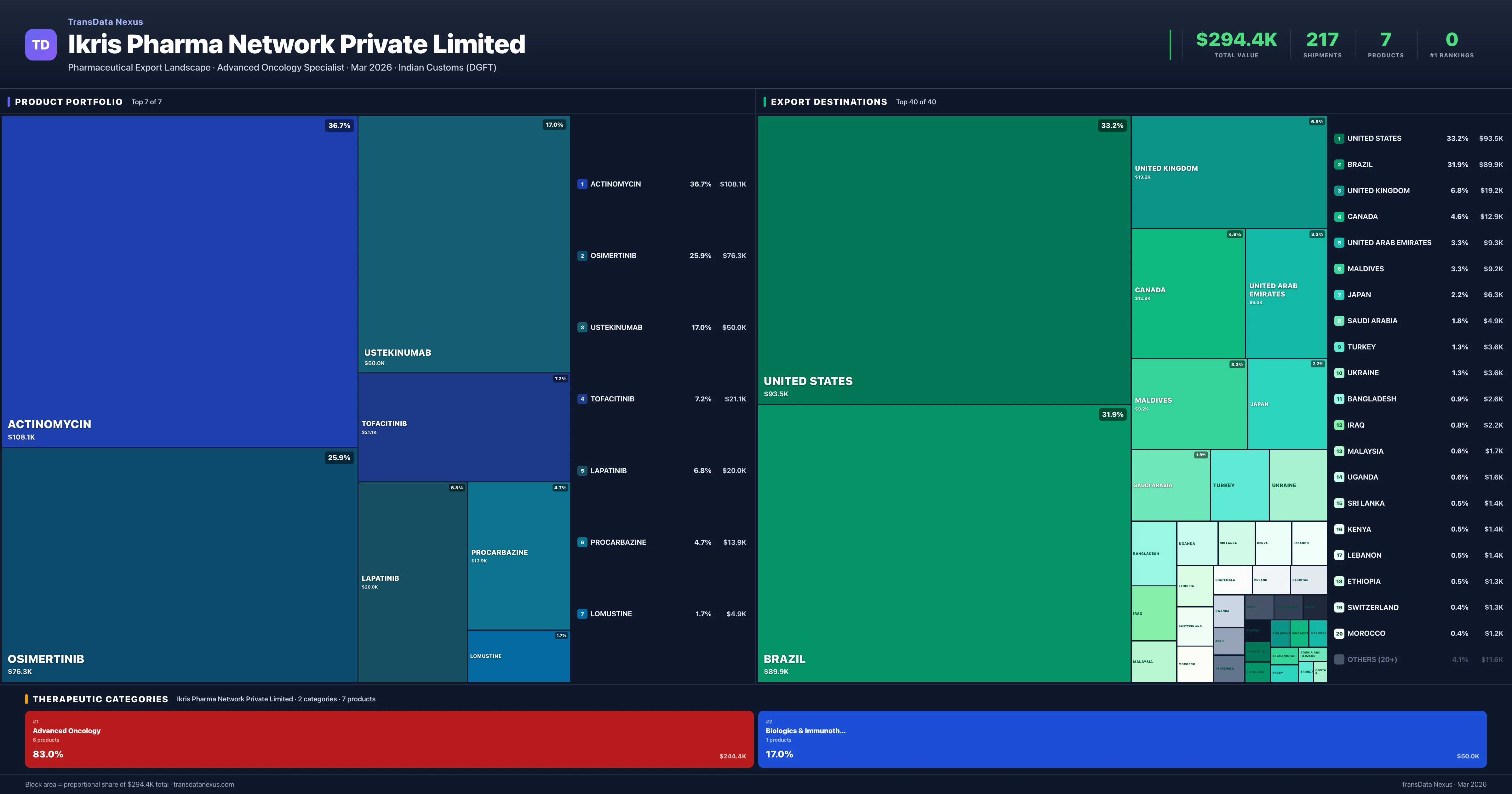 Ikris Pharma Network Private Limited is an Indian pharmaceutical exporter with a total trade value of $294.4K across 7 products in 2 therapeutic categories. Based on 217 verified export shipments from Indian Customs (DGFT) records, the company actively competes across multiple product segments. Top exports include Actinomycin ($108.1K), Osimertinib ($76.3K), Ustekinumab ($50.0K).