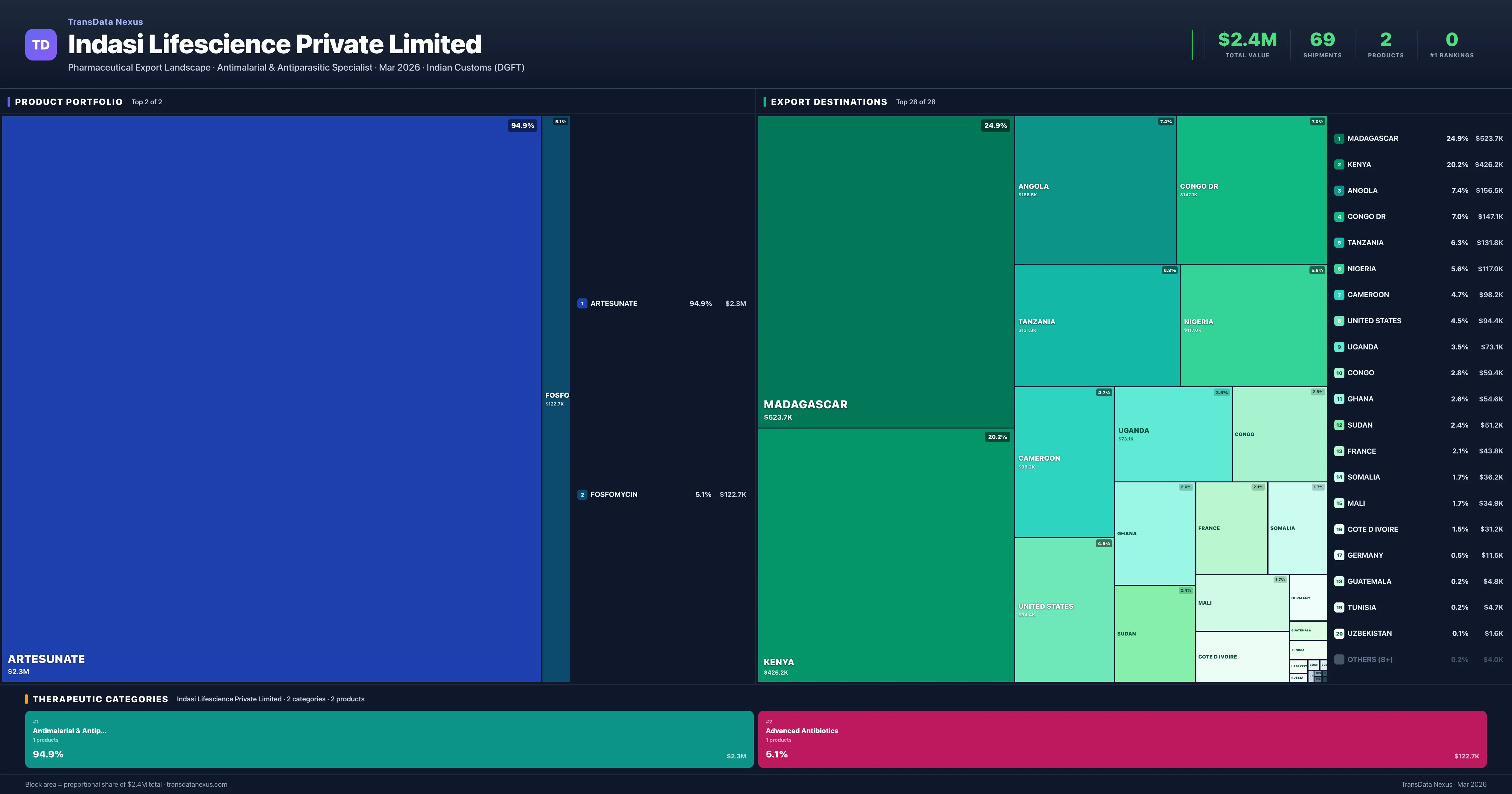 Indasi Lifescience Private Limited is an Indian pharmaceutical exporter with a total trade value of $2.4M across 2 products in 2 therapeutic categories. Based on 69 verified export shipments from Indian Customs (DGFT) records, the company actively competes across multiple product segments. Top exports include Artesunate ($2.3M), Fosfomycin ($122.7K), .