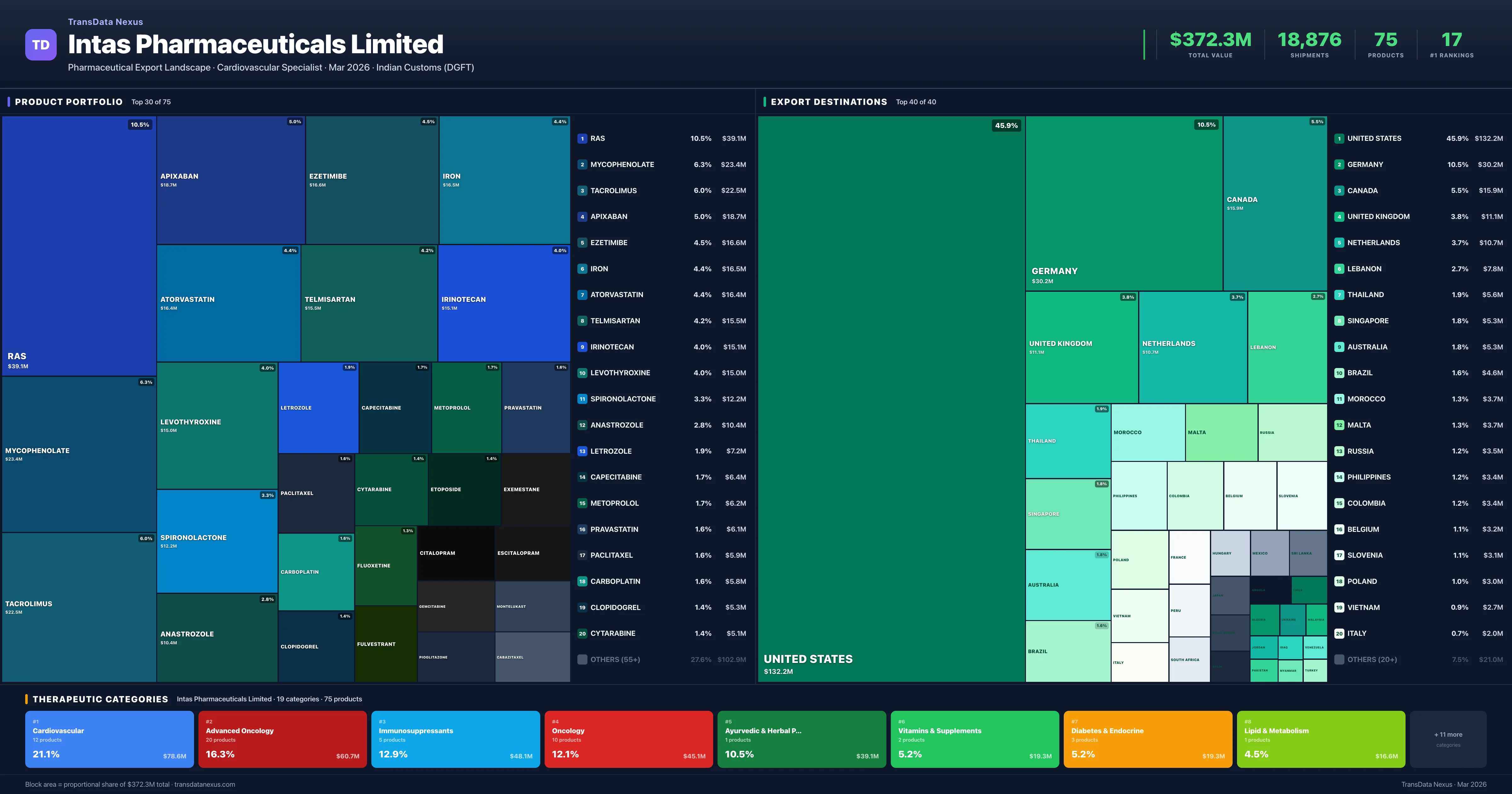 Intas Pharmaceuticals Limited is an Indian pharmaceutical exporter with a total trade value of $372.3M across 75 products in 19 therapeutic categories. Based on 18,876 verified export shipments from Indian Customs (DGFT) records, Intas Pharmaceuticals Limited is the #1 Indian exporter in 17 products including Mycophenolate, Atorvastatin, Irinotecan. Top exports include Ras ($39.1M), Mycophenolate ($23.4M), Tacrolimus ($22.5M).
