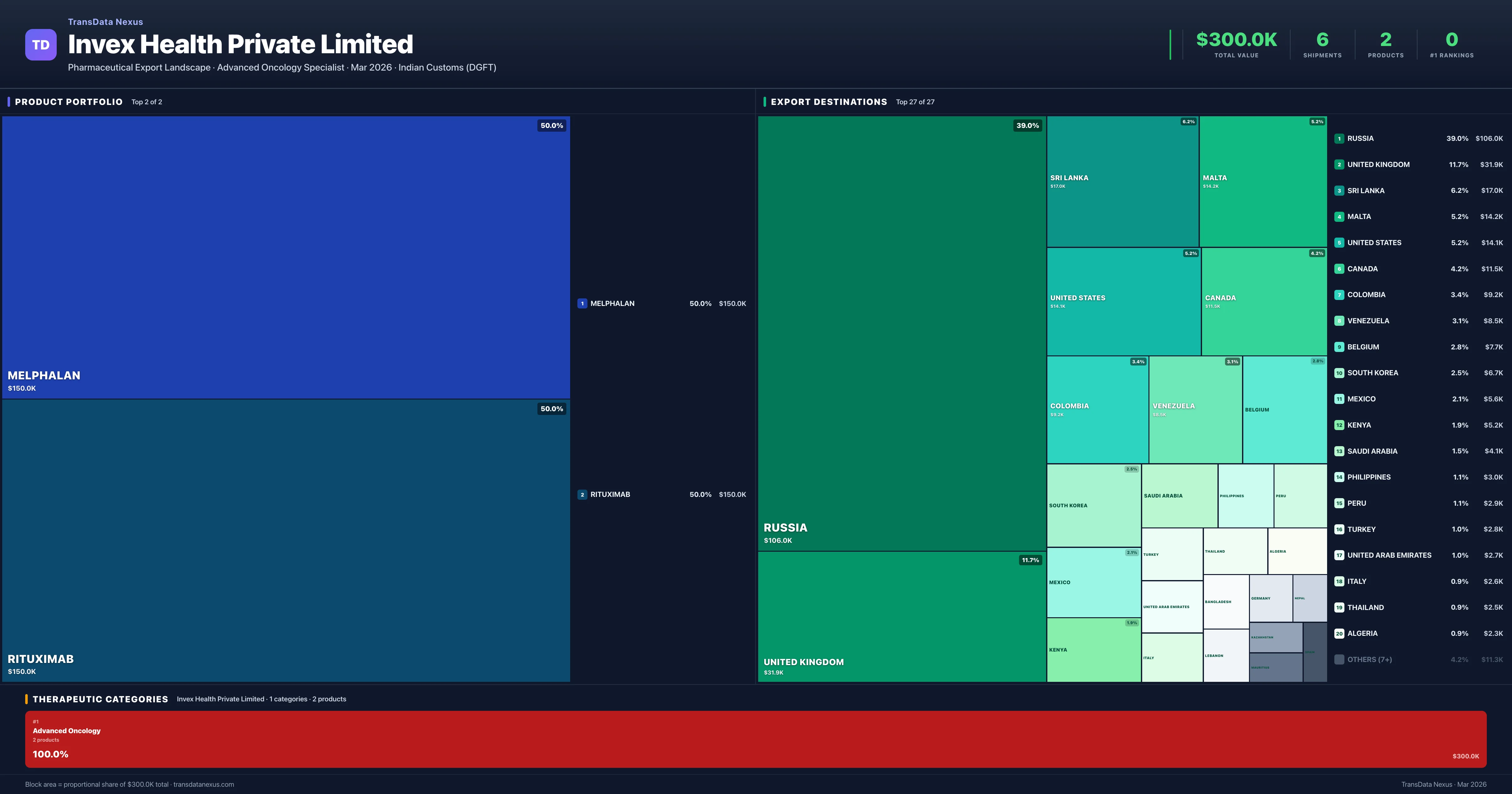 Invex Health Private Limited is an Indian pharmaceutical exporter with a total trade value of $300.0K across 2 products in 1 therapeutic categories. Based on 6 verified export shipments from Indian Customs (DGFT) records, the company actively competes across multiple product segments. Top exports include Melphalan ($150.0K), Rituximab ($150.0K), .