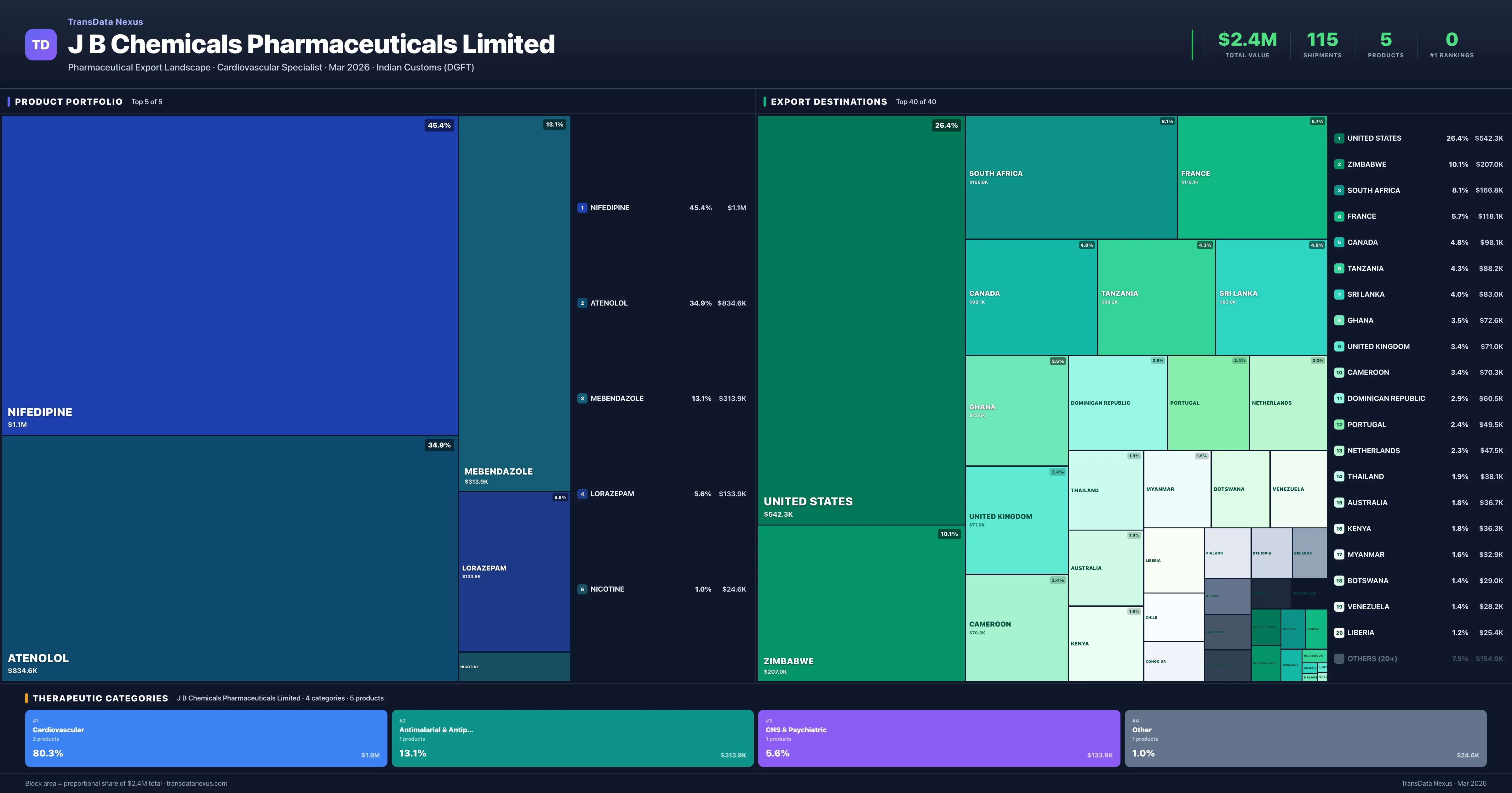 J B Chemicals Pharmaceuticals Limited is an Indian pharmaceutical exporter with a total trade value of $2.4M across 5 products in 4 therapeutic categories. Based on 115 verified export shipments from Indian Customs (DGFT) records, the company actively competes across multiple product segments. Top exports include Nifedipine ($1.1M), Atenolol ($834.6K), Mebendazole ($313.9K).