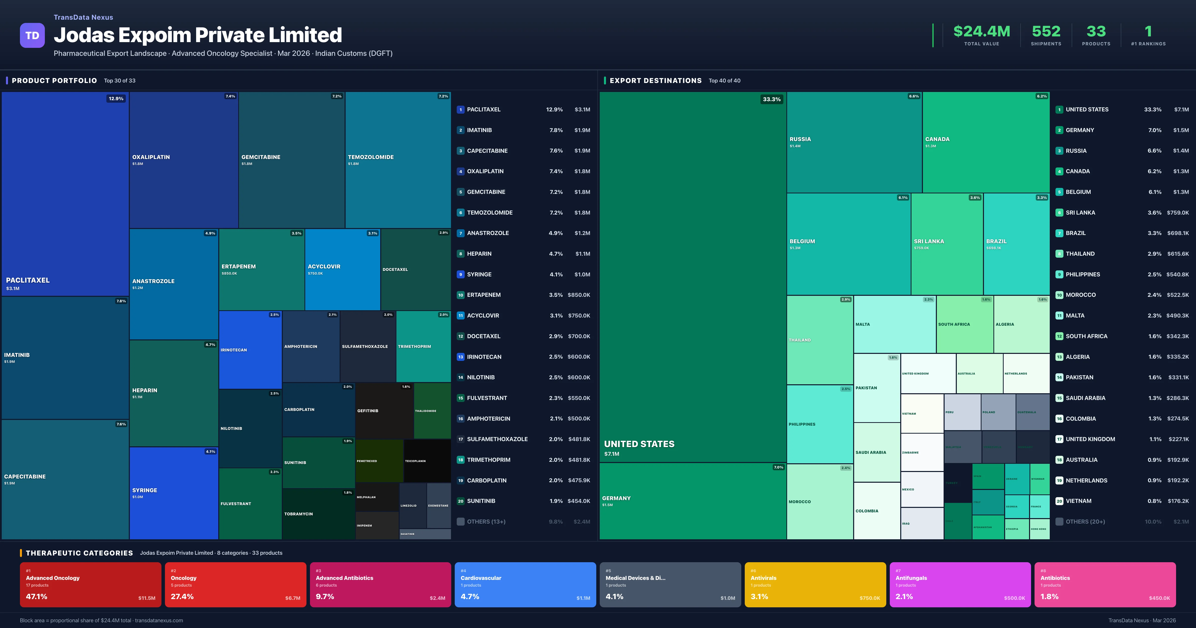 Jodas Expoim Private Limited is an Indian pharmaceutical exporter with a total trade value of $24.4M across 33 products in 8 therapeutic categories. Based on 552 verified export shipments from Indian Customs (DGFT) records, Jodas Expoim Private Limited is the #1 Indian exporter in 1 product including Nilotinib. Top exports include Paclitaxel ($3.1M), Imatinib ($1.9M), Capecitabine ($1.9M).