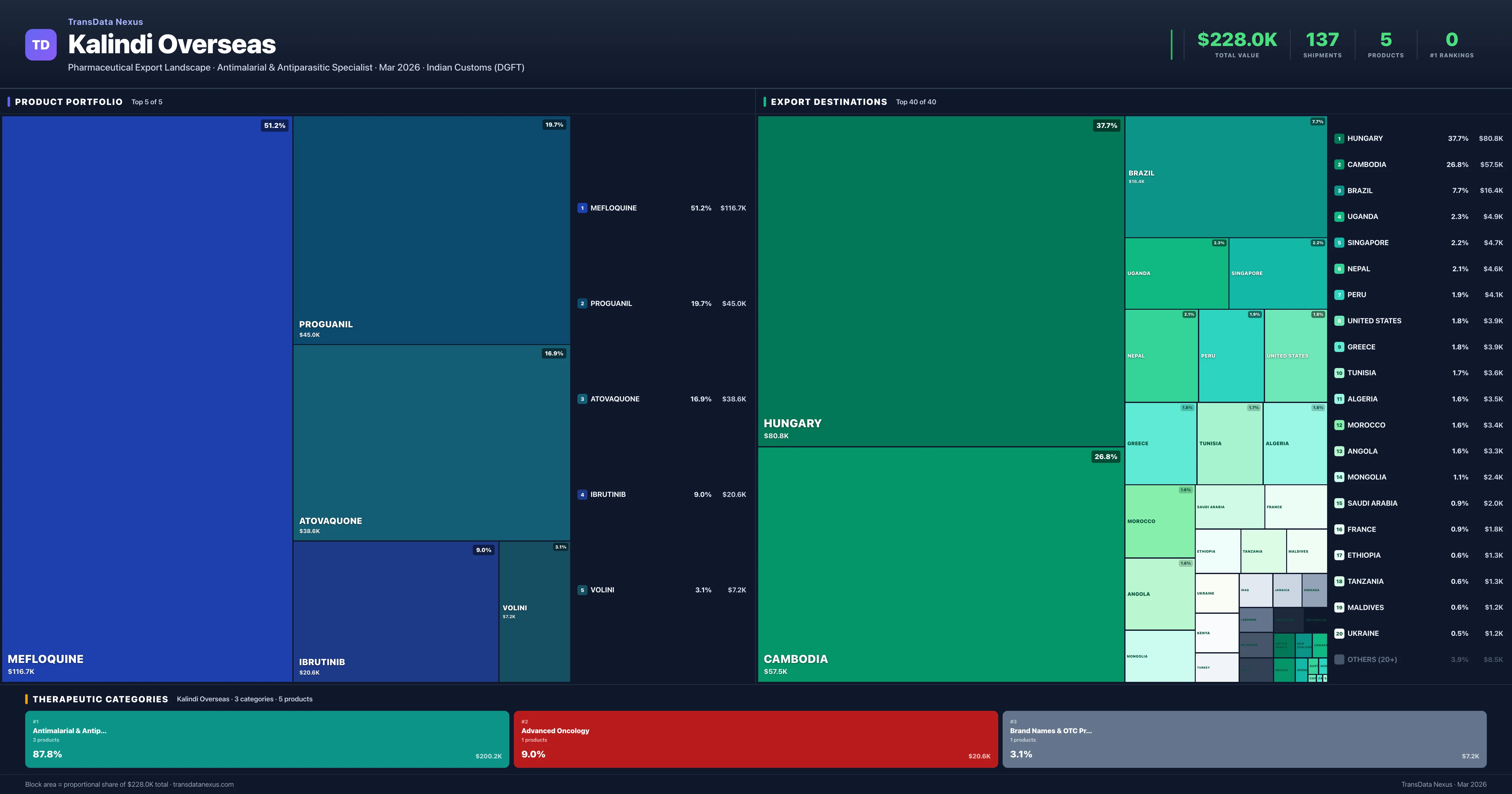 Kalindi Overseas is an Indian pharmaceutical exporter with a total trade value of $228.0K across 5 products in 3 therapeutic categories. Based on 137 verified export shipments from Indian Customs (DGFT) records, the company actively competes across multiple product segments. Top exports include Mefloquine ($116.7K), Proguanil ($45.0K), Atovaquone ($38.6K).