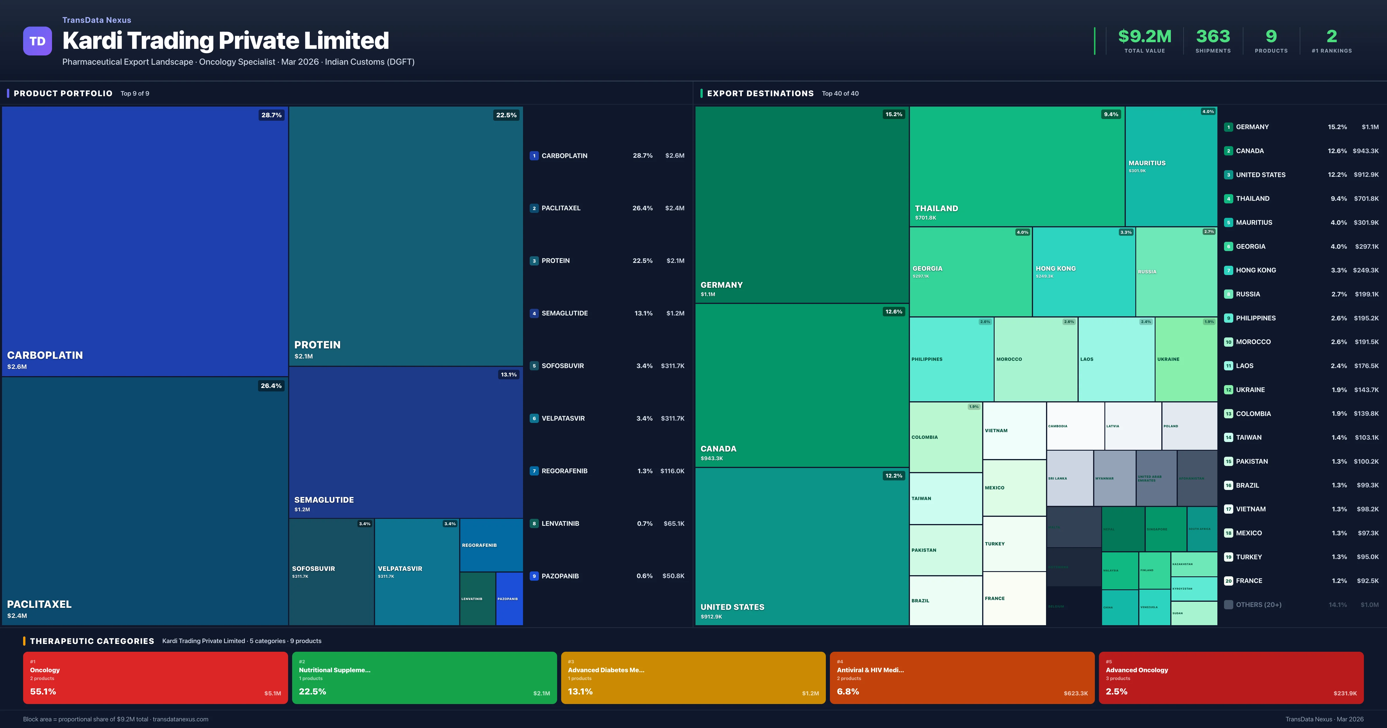 Kardi Trading Private Limited is an Indian pharmaceutical exporter with a total trade value of $9.2M across 9 products in 5 therapeutic categories. Based on 363 verified export shipments from Indian Customs (DGFT) records, Kardi Trading Private Limited is the #1 Indian exporter in 2 products including Semaglutide, Regorafenib. Top exports include Carboplatin ($2.6M), Paclitaxel ($2.4M), Protein ($2.1M).