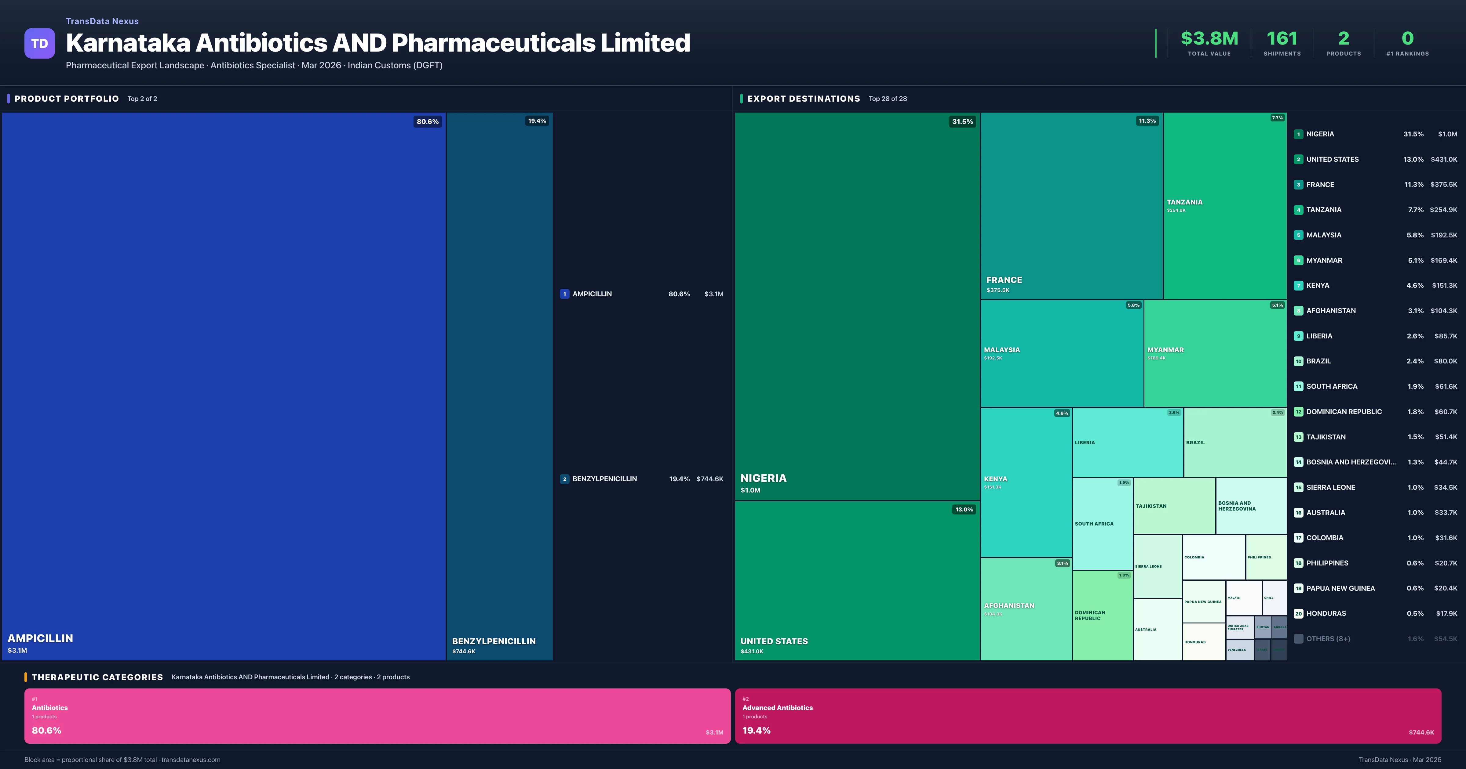 Karnataka Antibiotics AND Pharmaceuticals Limited's total pharmaceutical export value is $3.8M, based on 161 verified shipments recorded in Indian Customs (DGFT) data.