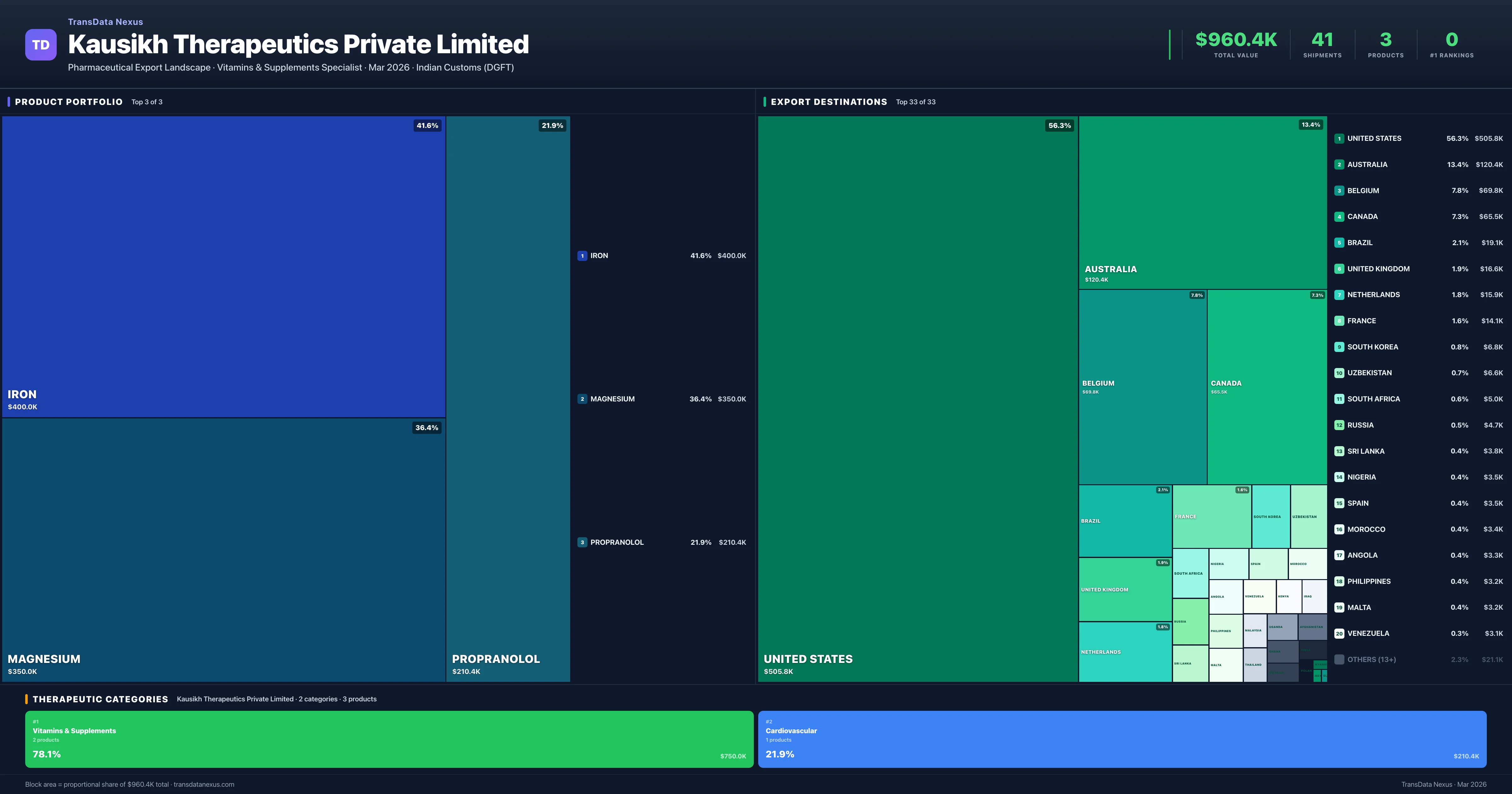 Kausikh Therapeutics Private Limited is an Indian pharmaceutical exporter with a total trade value of $960.4K across 3 products in 2 therapeutic categories. Based on 41 verified export shipments from Indian Customs (DGFT) records, the company actively competes across multiple product segments. Top exports include Iron ($400.0K), Magnesium ($350.0K), Propranolol ($210.4K).