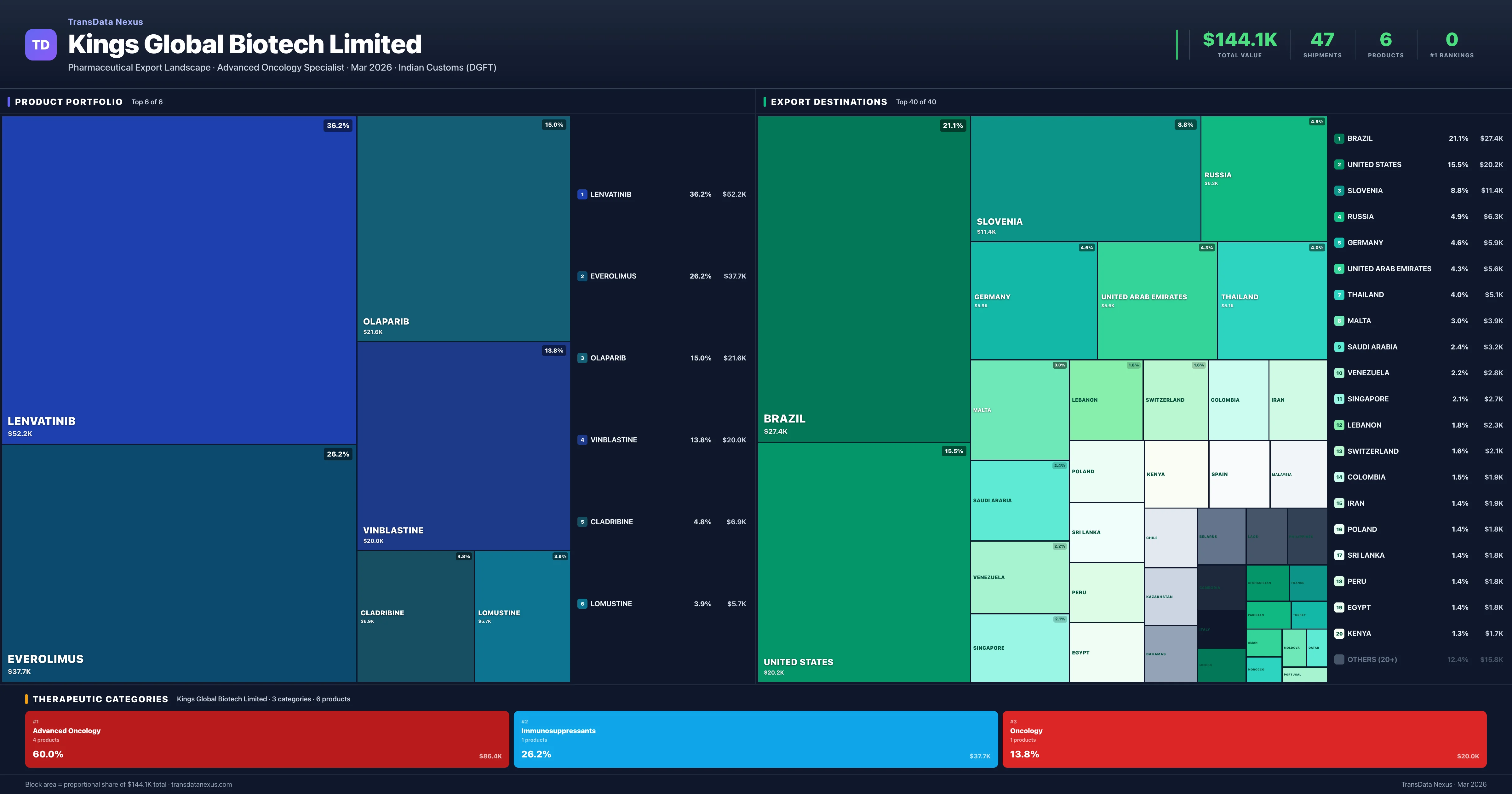 Kings Global Biotech Limited is an Indian pharmaceutical exporter with a total trade value of $144.1K across 6 products in 3 therapeutic categories. Based on 47 verified export shipments from Indian Customs (DGFT) records, the company actively competes across multiple product segments. Top exports include Lenvatinib ($52.2K), Everolimus ($37.7K), Olaparib ($21.6K).