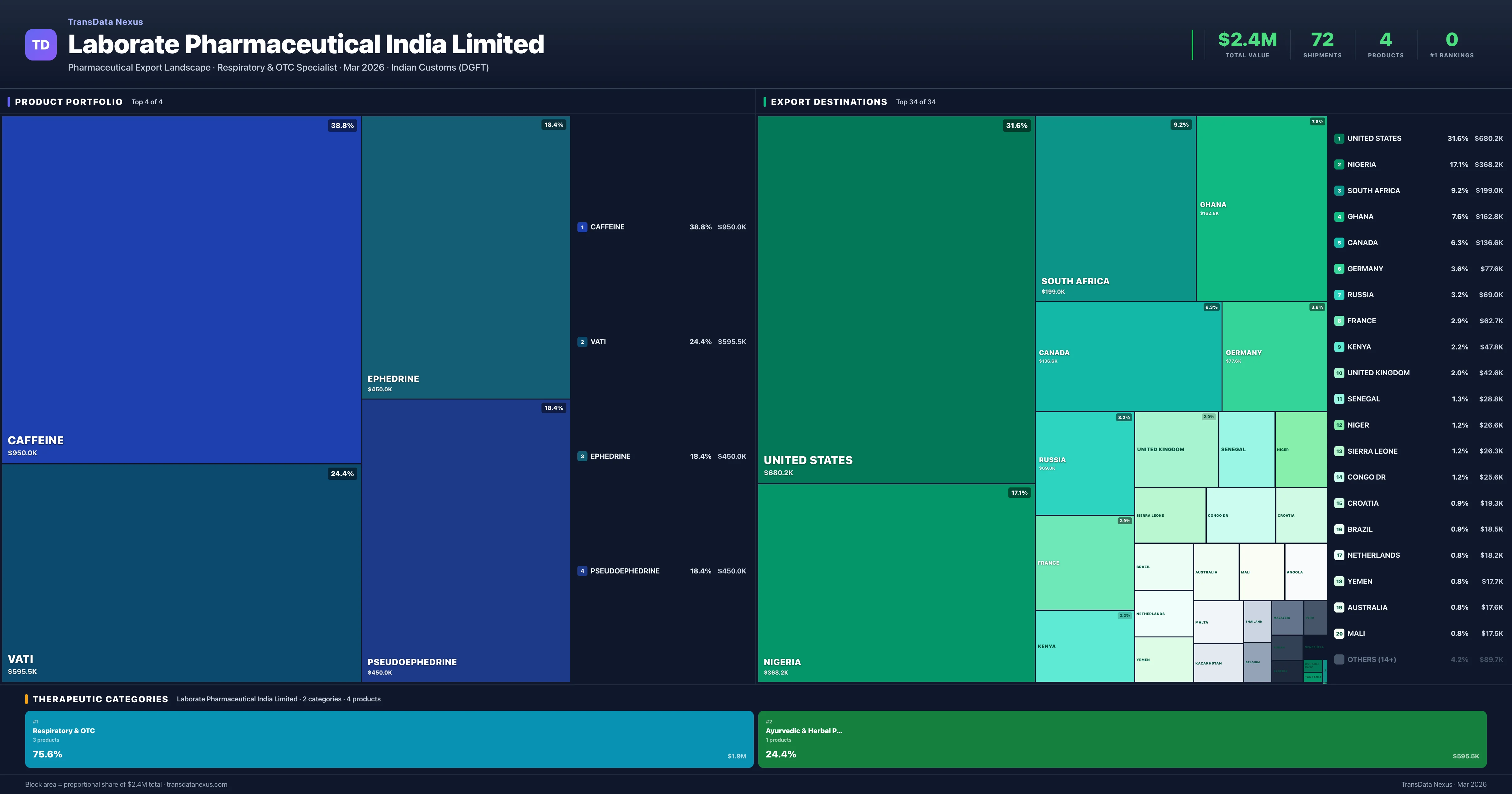 Laborate Pharmaceutical India Limited is an Indian pharmaceutical exporter with a total trade value of $2.4M across 4 products in 2 therapeutic categories. Based on 72 verified export shipments from Indian Customs (DGFT) records, the company actively competes across multiple product segments. Top exports include Caffeine ($950.0K), Vati ($595.5K), Ephedrine ($450.0K).