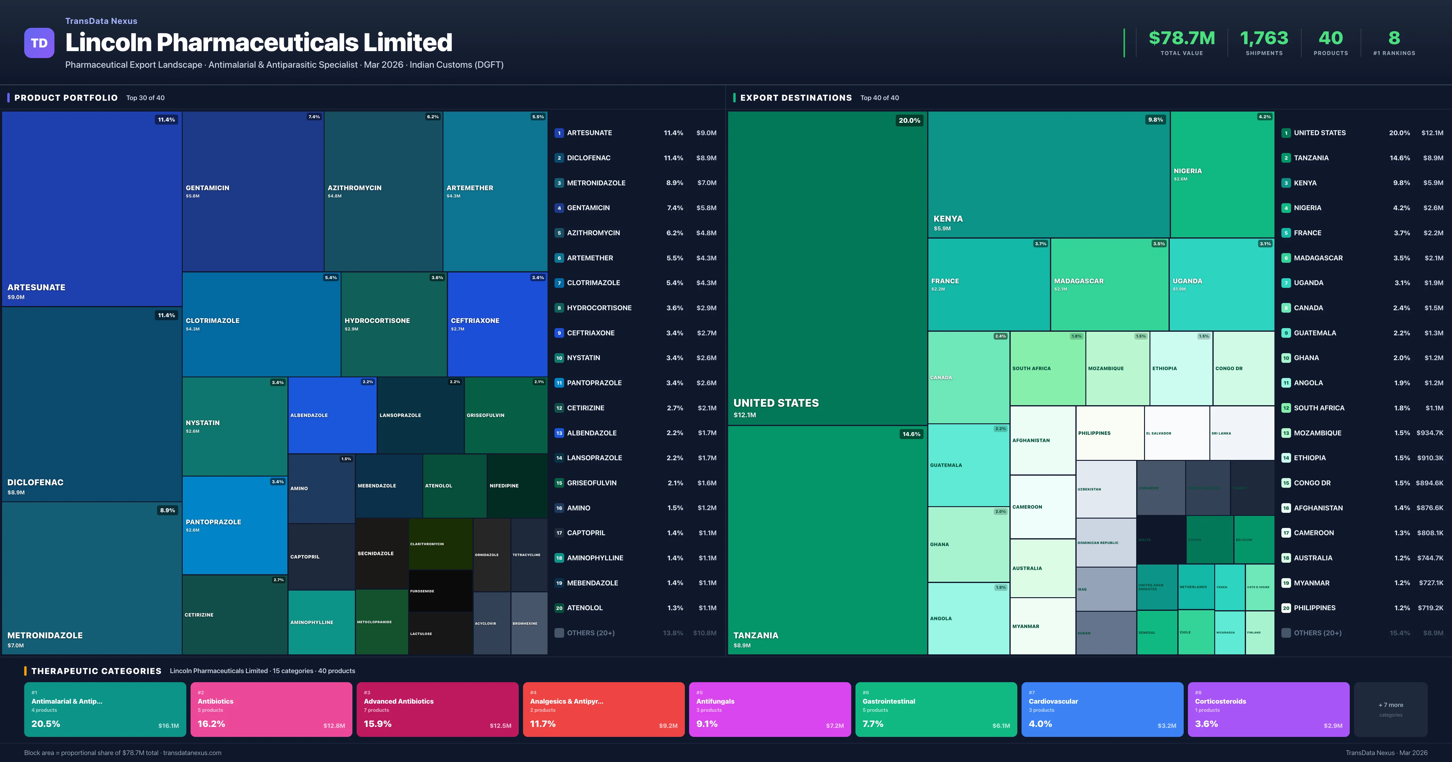 Lincoln Pharmaceuticals Limited exports 40 pharmaceutical products across 15 therapeutic categories. The top exports are Artesunate ($9.0M), Diclofenac ($8.9M), Metronidazole ($7.0M), Gentamicin ($5.8M), Azithromycin ($4.8M). Total export value is $78.7M.