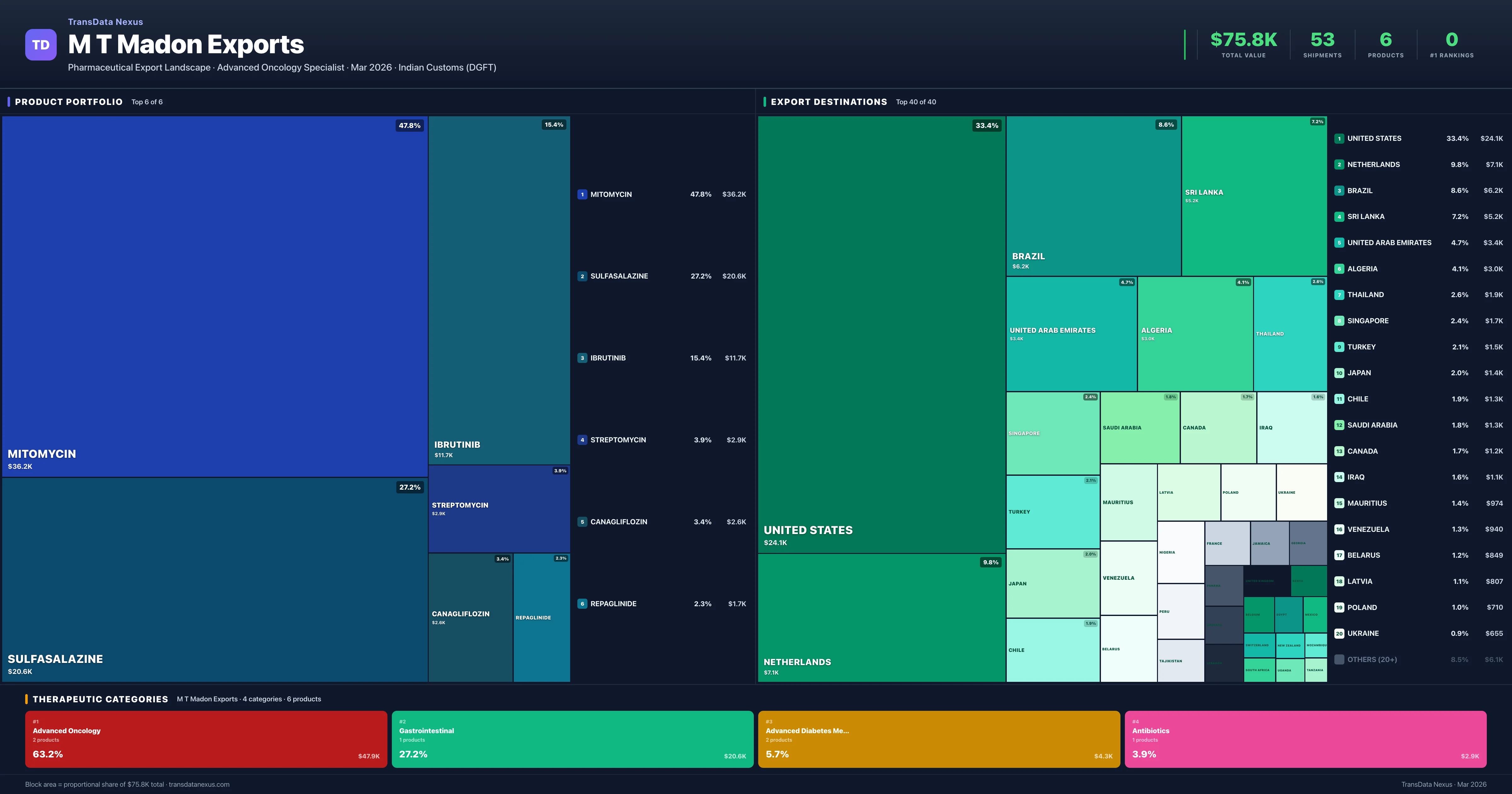 M T Madon Exports exports 6 pharmaceutical products across 4 therapeutic categories with a total export value of $75.8K. The top category is Advanced Oncology (63.2% of portfolio), followed by Gastrointestinal (27.2%), indicating a concentrated portfolio with the top 5 products accounting for 97.7% of total export value.