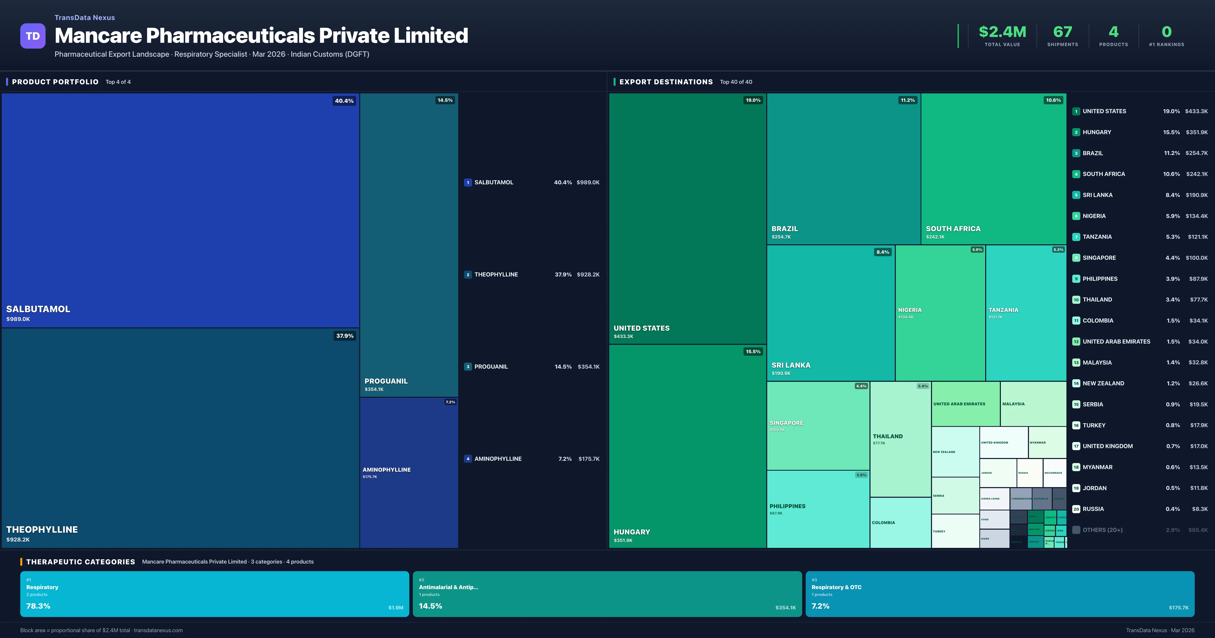 Mancare Pharmaceuticals Private Limited is an Indian pharmaceutical exporter with a total trade value of $2.4M across 4 products in 3 therapeutic categories. Based on 67 verified export shipments from Indian Customs (DGFT) records, the company actively competes across multiple product segments. Top exports include Salbutamol ($989.0K), Theophylline ($928.2K), Proguanil ($354.1K).