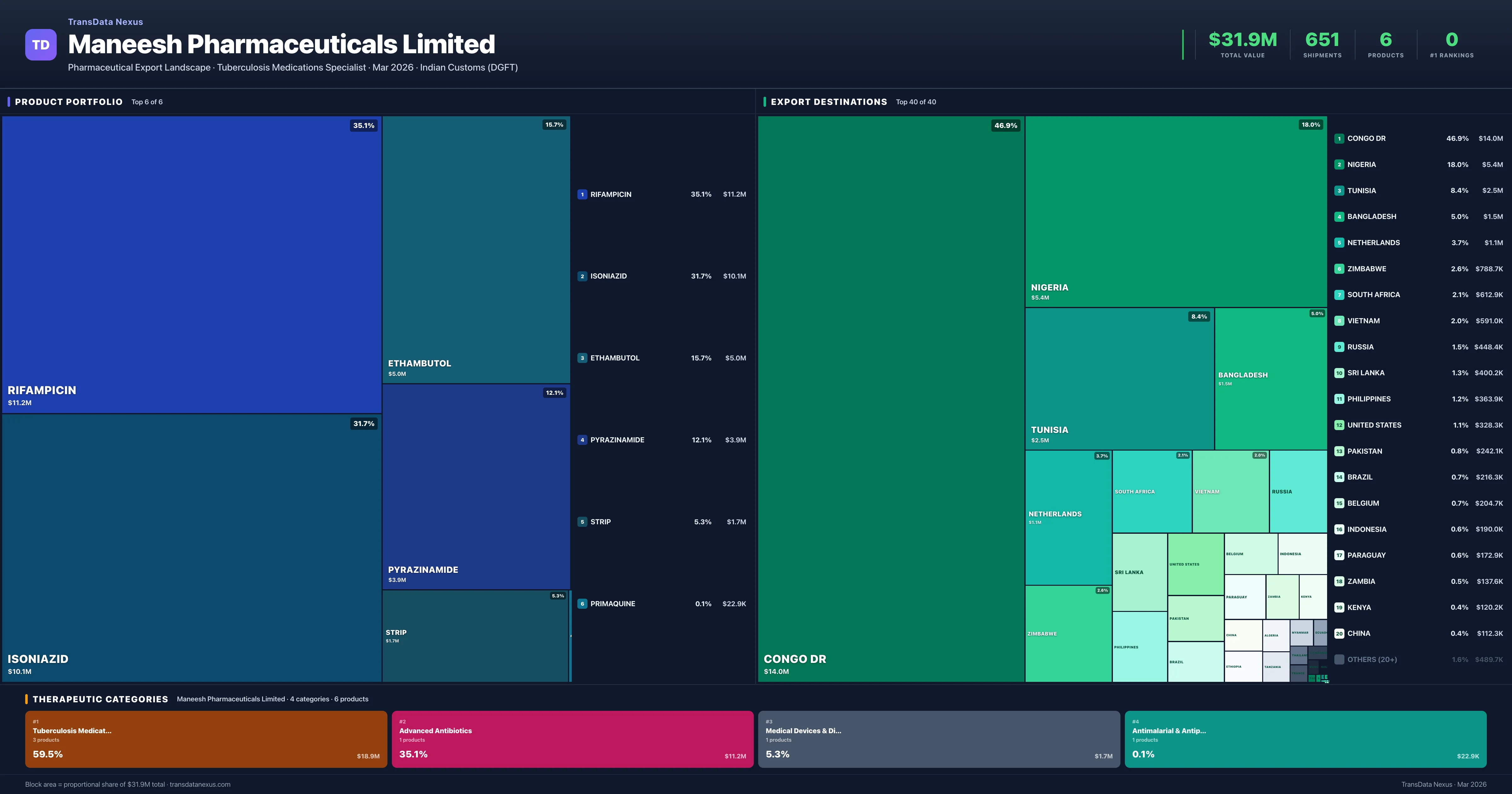 Maneesh Pharmaceuticals Limited is an Indian pharmaceutical exporter with a total trade value of $31.9M across 6 products in 4 therapeutic categories. Based on 651 verified export shipments from Indian Customs (DGFT) records, the company actively competes across multiple product segments. Top exports include Rifampicin ($11.2M), Isoniazid ($10.1M), Ethambutol ($5.0M).