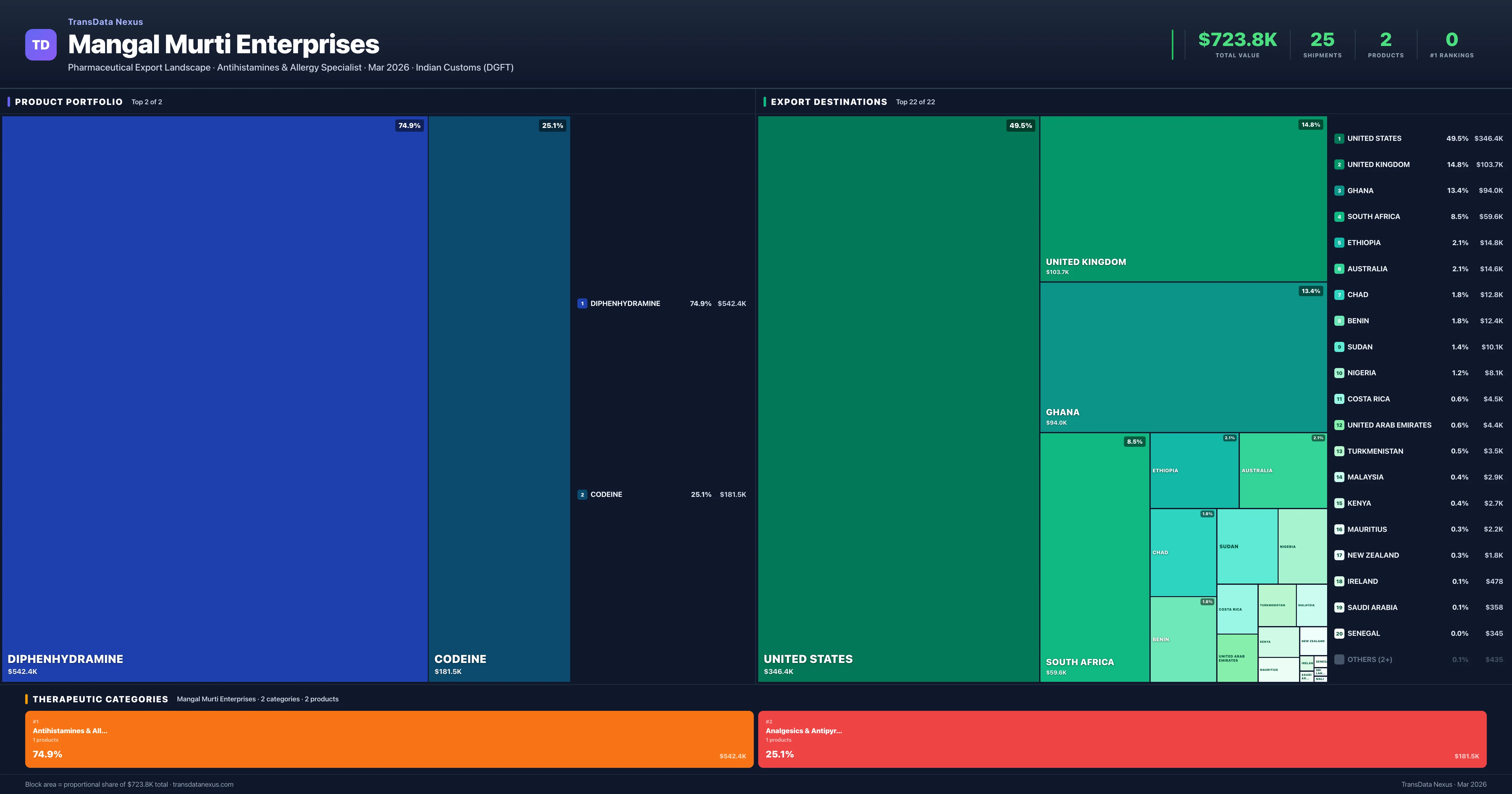 Mangal Murti Enterprises exports 2 pharmaceutical products across 2 therapeutic categories. The top exports are Diphenhydramine ($542.4K), Codeine ($181.5K). Total export value is $723.8K.