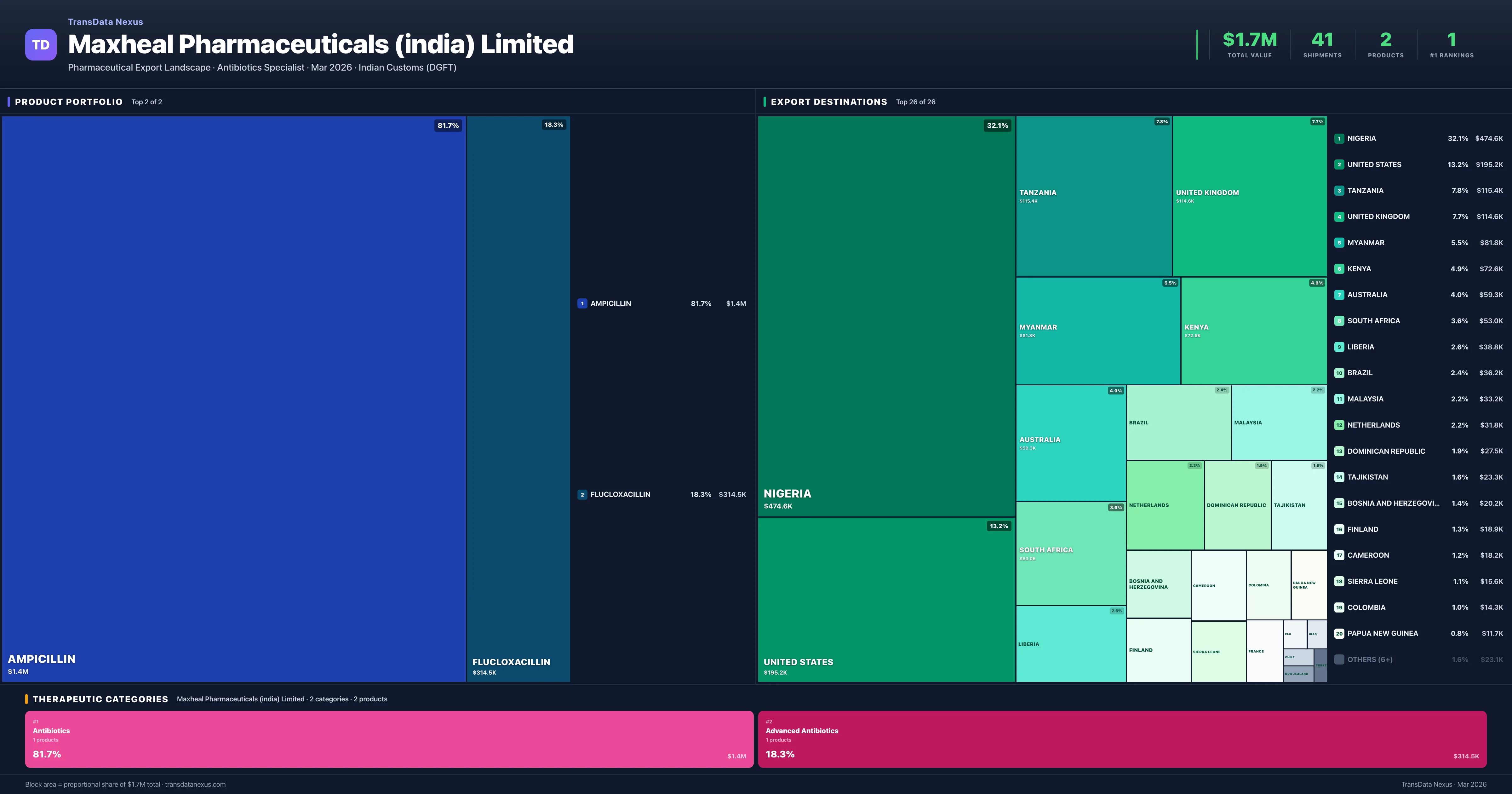 Maxheal Pharmaceuticals (india) Limited is an Indian pharmaceutical exporter with a total trade value of $1.7M across 2 products in 2 therapeutic categories. Based on 41 verified export shipments from Indian Customs (DGFT) records, Maxheal Pharmaceuticals (india) Limited is the #1 Indian exporter in 1 product including Ampicillin. Top exports include Ampicillin ($1.4M), Flucloxacillin ($314.5K), .