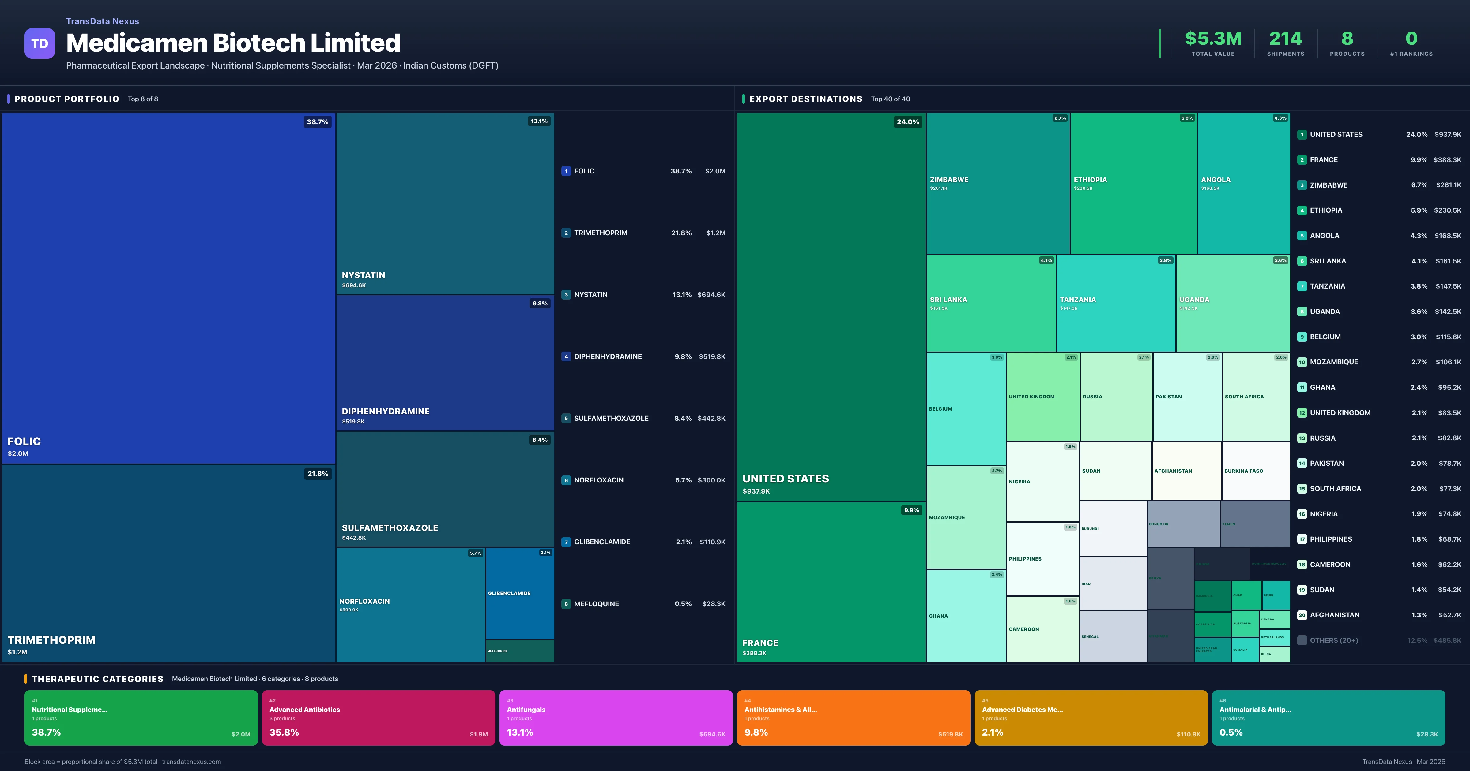 Medicamen Biotech Limited exports 8 pharmaceutical products across 6 therapeutic categories. The top exports are Folic ($2.0M), Trimethoprim ($1.2M), Nystatin ($694.6K), Diphenhydramine ($519.8K), Sulfamethoxazole ($442.8K). Total export value is $5.3M.