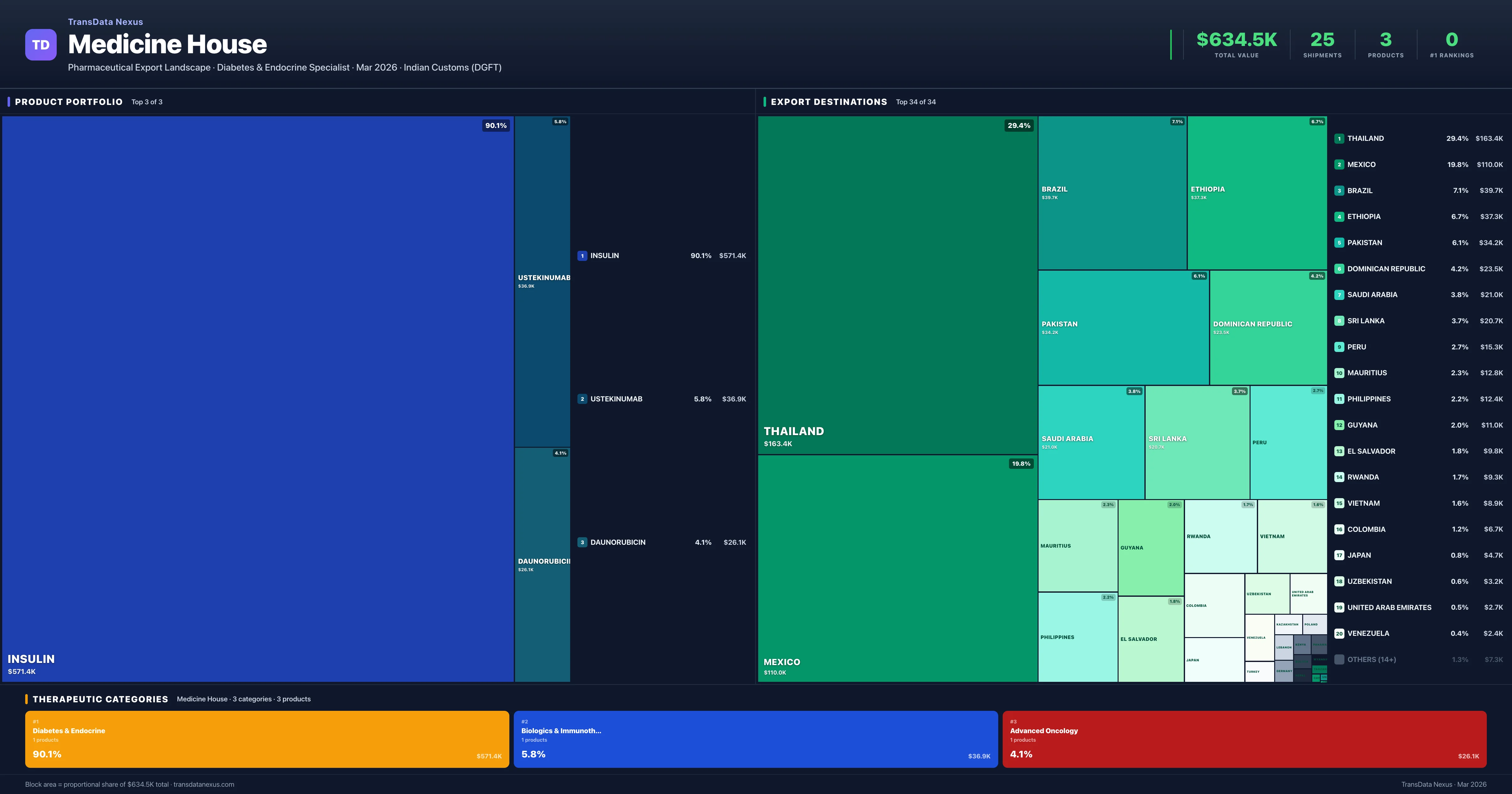 Medicine House is an Indian pharmaceutical exporter with a total trade value of $634.5K across 3 products in 3 therapeutic categories. Based on 25 verified export shipments from Indian Customs (DGFT) records, the company actively competes across multiple product segments. Top exports include Insulin ($571.4K), Ustekinumab ($36.9K), Daunorubicin ($26.1K).