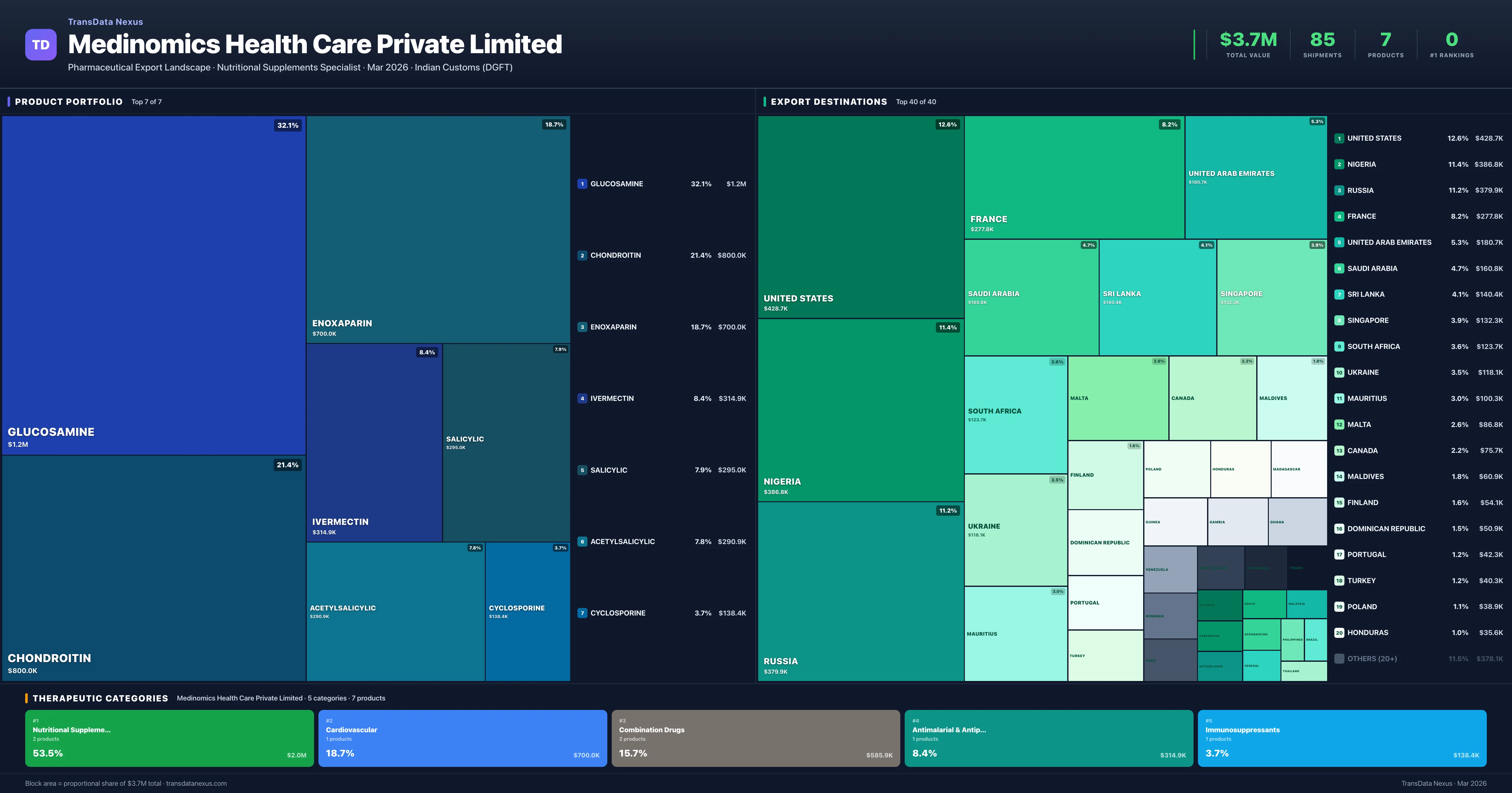 Medinomics Health Care Private Limited is an Indian pharmaceutical exporter with a total trade value of $3.7M across 7 products in 5 therapeutic categories. Based on 85 verified export shipments from Indian Customs (DGFT) records, the company actively competes across multiple product segments. Top exports include Glucosamine ($1.2M), Chondroitin ($800.0K), Enoxaparin ($700.0K).