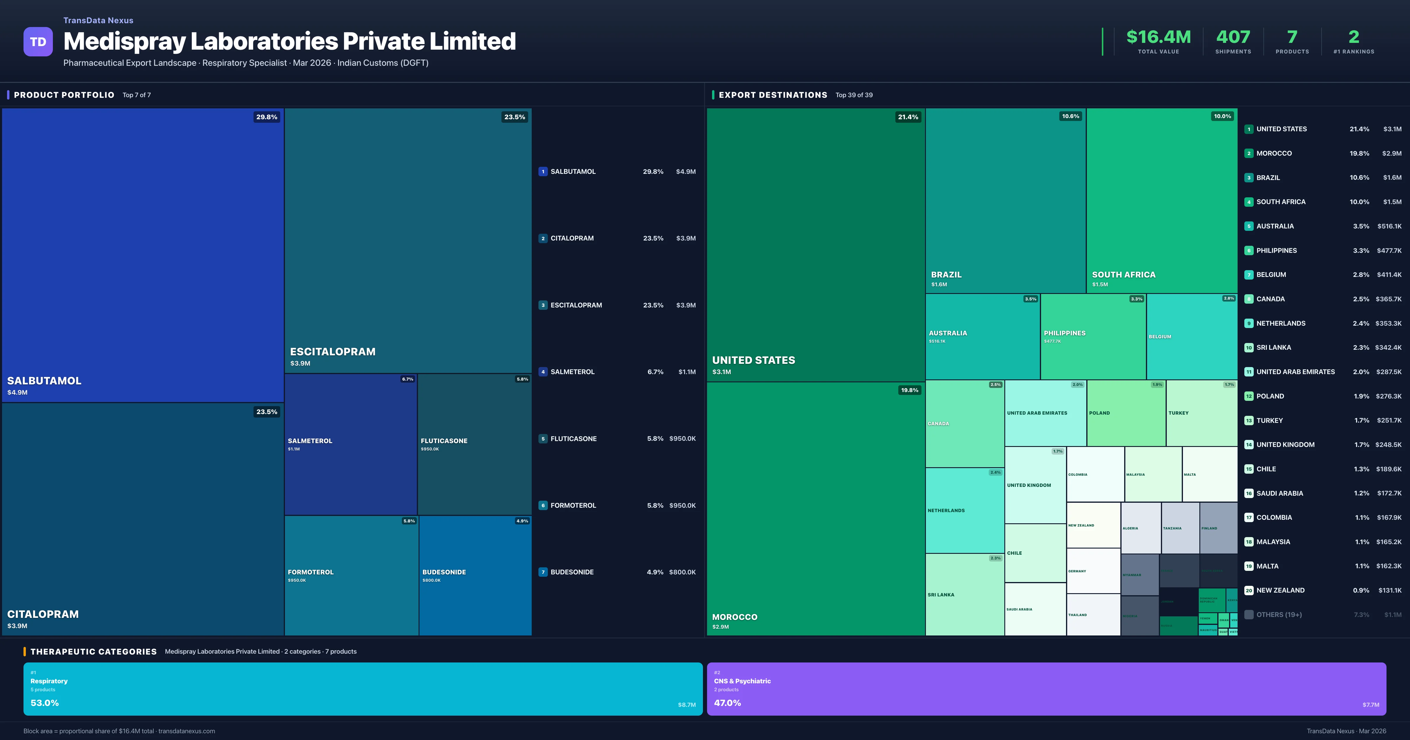 Medispray Laboratories Private Limited is an Indian pharmaceutical exporter with a total trade value of $16.4M across 7 products in 2 therapeutic categories. Based on 407 verified export shipments from Indian Customs (DGFT) records, Medispray Laboratories Private Limited is the #1 Indian exporter in 2 products including Citalopram, Escitalopram. Top exports include Salbutamol ($4.9M), Citalopram ($3.9M), Escitalopram ($3.9M).