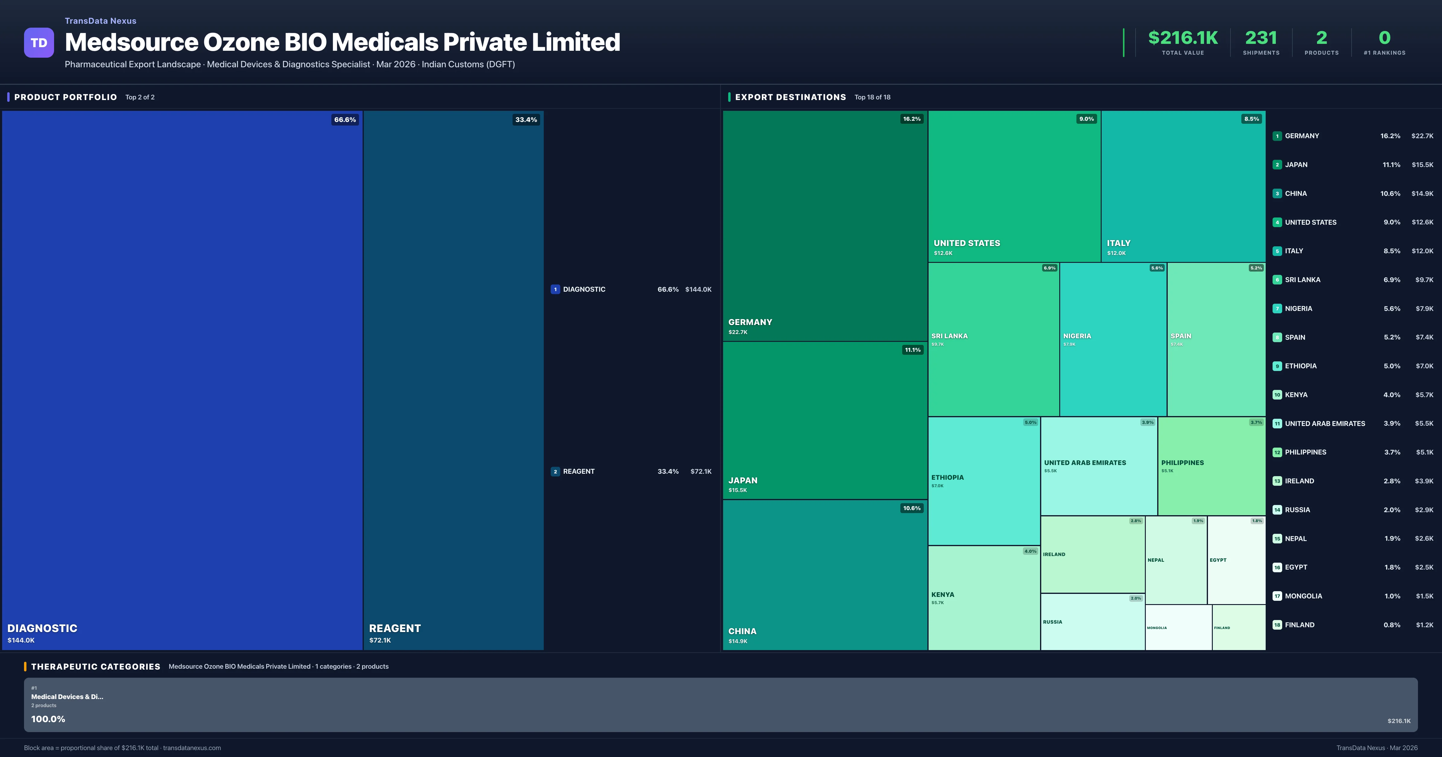 Medsource Ozone BIO Medicals Private Limited is an Indian pharmaceutical exporter with a total trade value of $216.1K across 2 products in 1 therapeutic categories. Based on 231 verified export shipments from Indian Customs (DGFT) records, the company actively competes across multiple product segments. Top exports include Diagnostic ($144.0K), Reagent ($72.1K), .