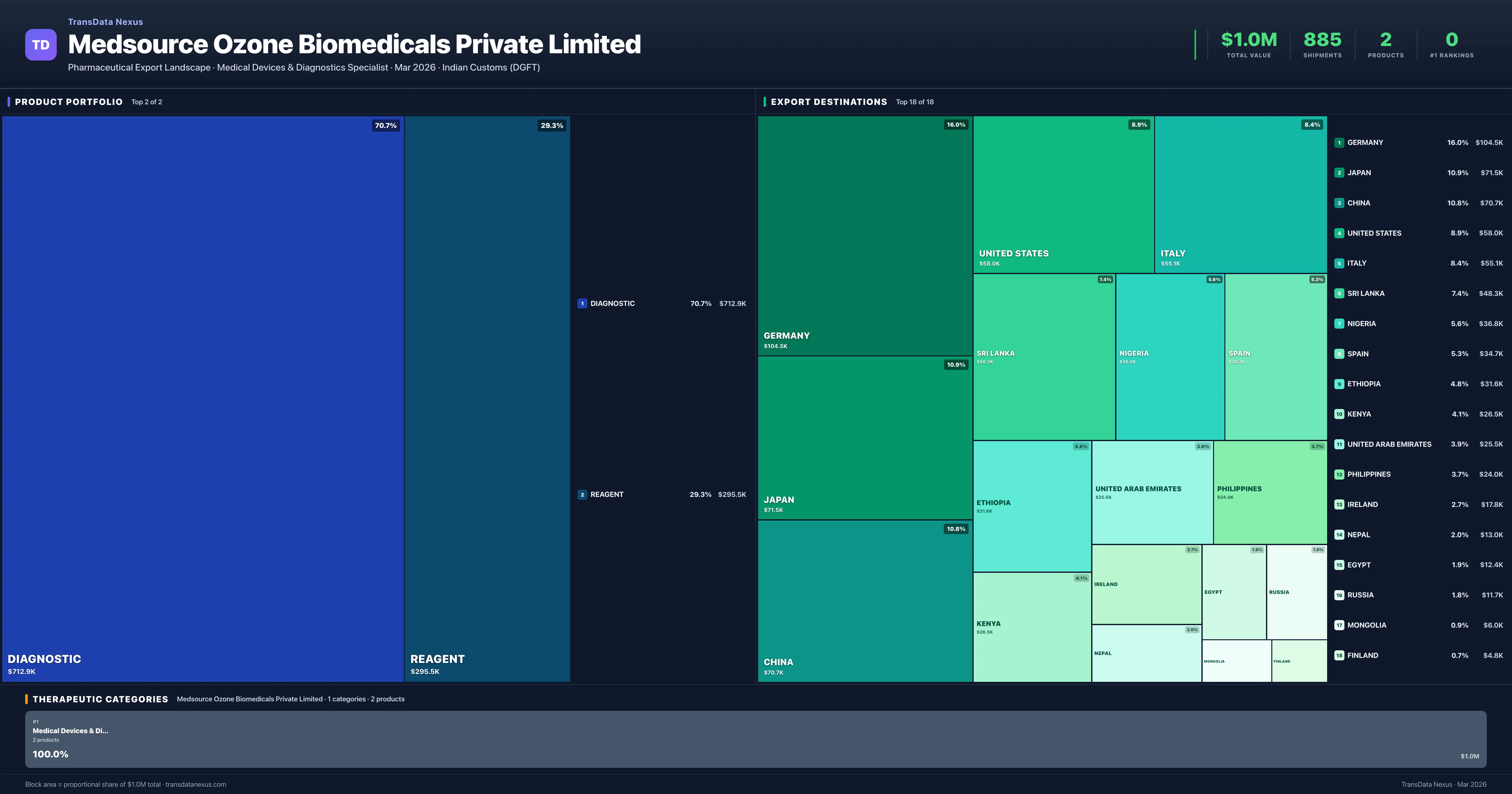 Medsource Ozone Biomedicals Private Limited is an Indian pharmaceutical exporter with a total trade value of $1.0M across 2 products in 1 therapeutic categories. Based on 885 verified export shipments from Indian Customs (DGFT) records, the company actively competes across multiple product segments. Top exports include Diagnostic ($712.9K), Reagent ($295.5K), .