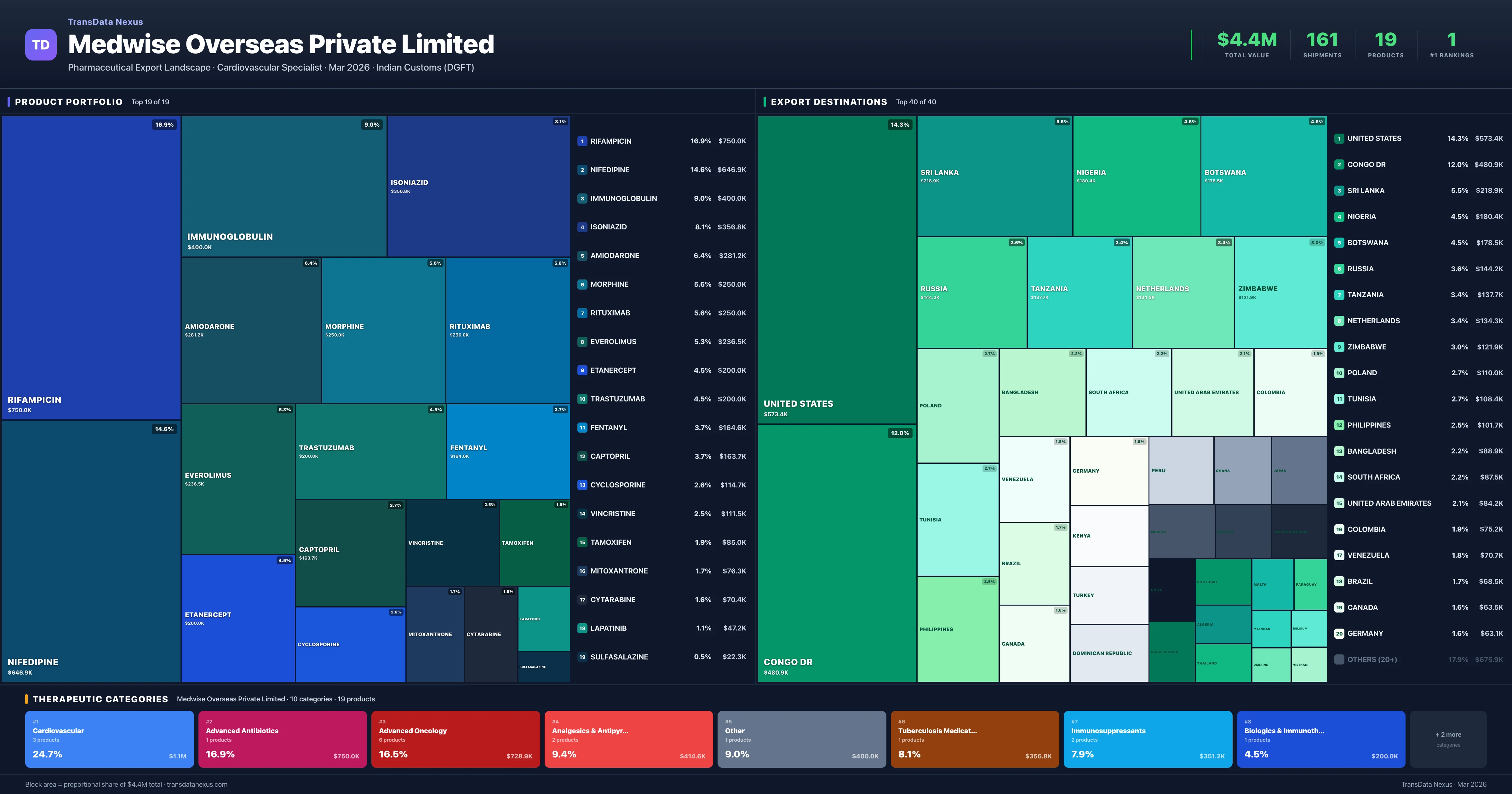 Medwise Overseas Private Limited is an Indian pharmaceutical exporter with a total trade value of $4.4M across 19 products in 10 therapeutic categories. Based on 161 verified export shipments from Indian Customs (DGFT) records, Medwise Overseas Private Limited is the #1 Indian exporter in 1 product including Morphine. Top exports include Rifampicin ($750.0K), Nifedipine ($646.9K), Immunoglobulin ($400.0K).
