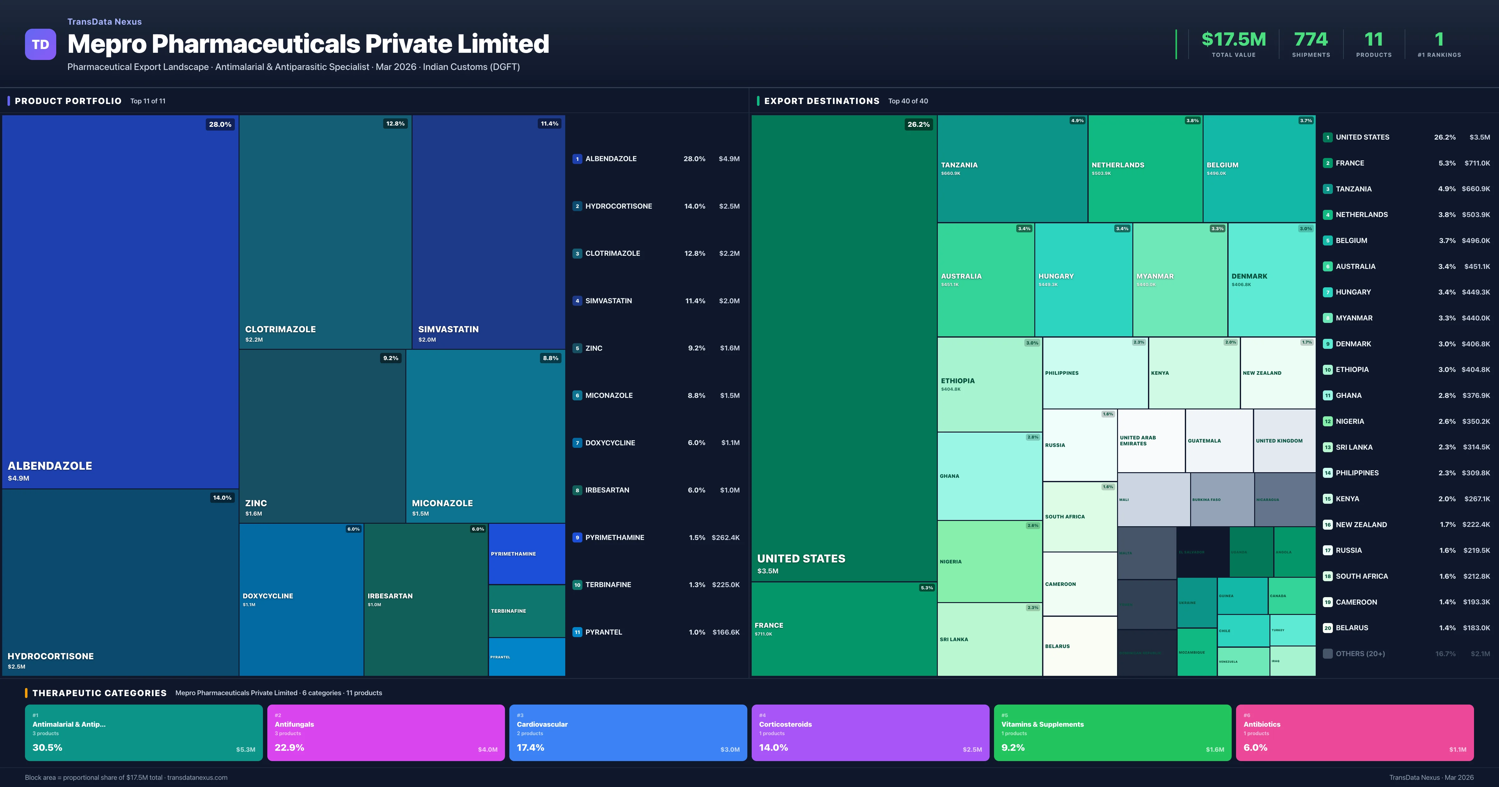 Mepro Pharmaceuticals Private Limited is an Indian pharmaceutical exporter with a total trade value of $17.5M across 11 products in 6 therapeutic categories. Based on 774 verified export shipments from Indian Customs (DGFT) records, Mepro Pharmaceuticals Private Limited is the #1 Indian exporter in 1 product including Albendazole. Top exports include Albendazole ($4.9M), Hydrocortisone ($2.5M), Clotrimazole ($2.2M).