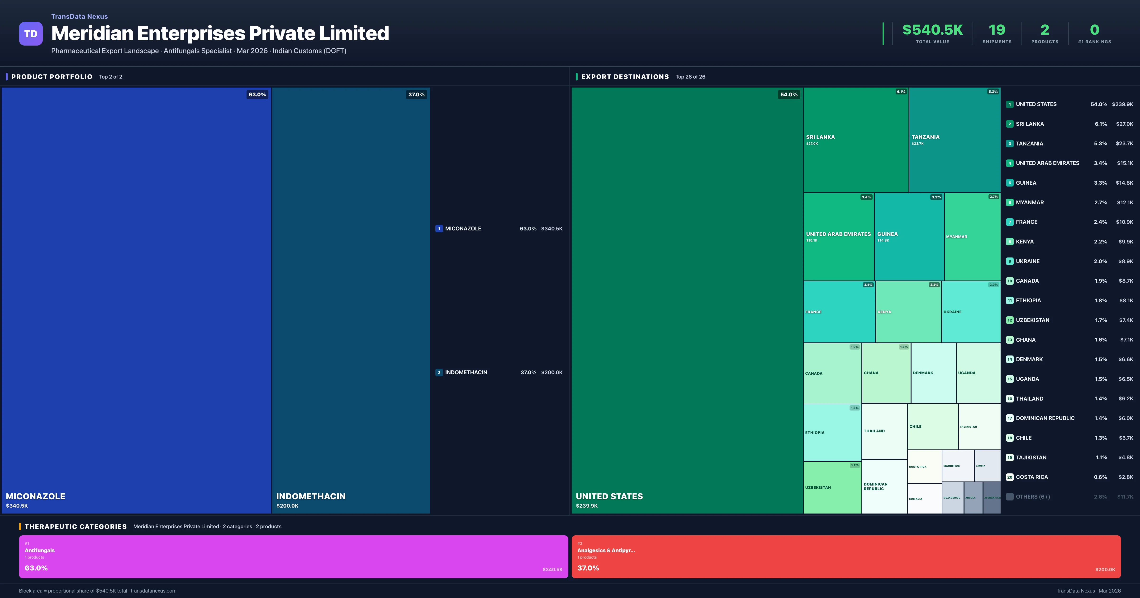 Meridian Enterprises Private Limited is an Indian pharmaceutical exporter with a total trade value of $540.5K across 2 products in 2 therapeutic categories. Based on 19 verified export shipments from Indian Customs (DGFT) records, the company actively competes across multiple product segments. Top exports include Miconazole ($340.5K), Indomethacin ($200.0K), .