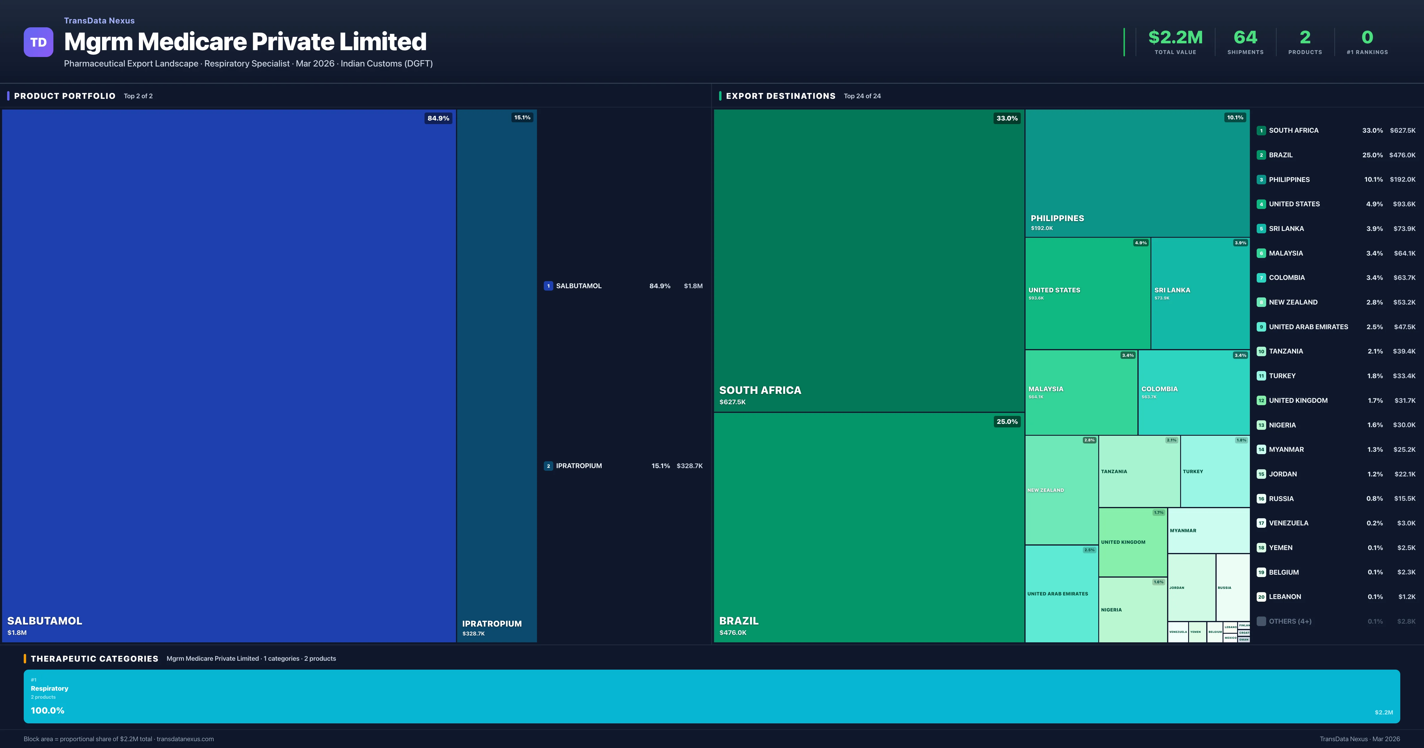 Mgrm Medicare Private Limited is an Indian pharmaceutical exporter with a total trade value of $2.2M across 2 products in 1 therapeutic categories. Based on 64 verified export shipments from Indian Customs (DGFT) records, the company actively competes across multiple product segments. Top exports include Salbutamol ($1.8M), Ipratropium ($328.7K), .