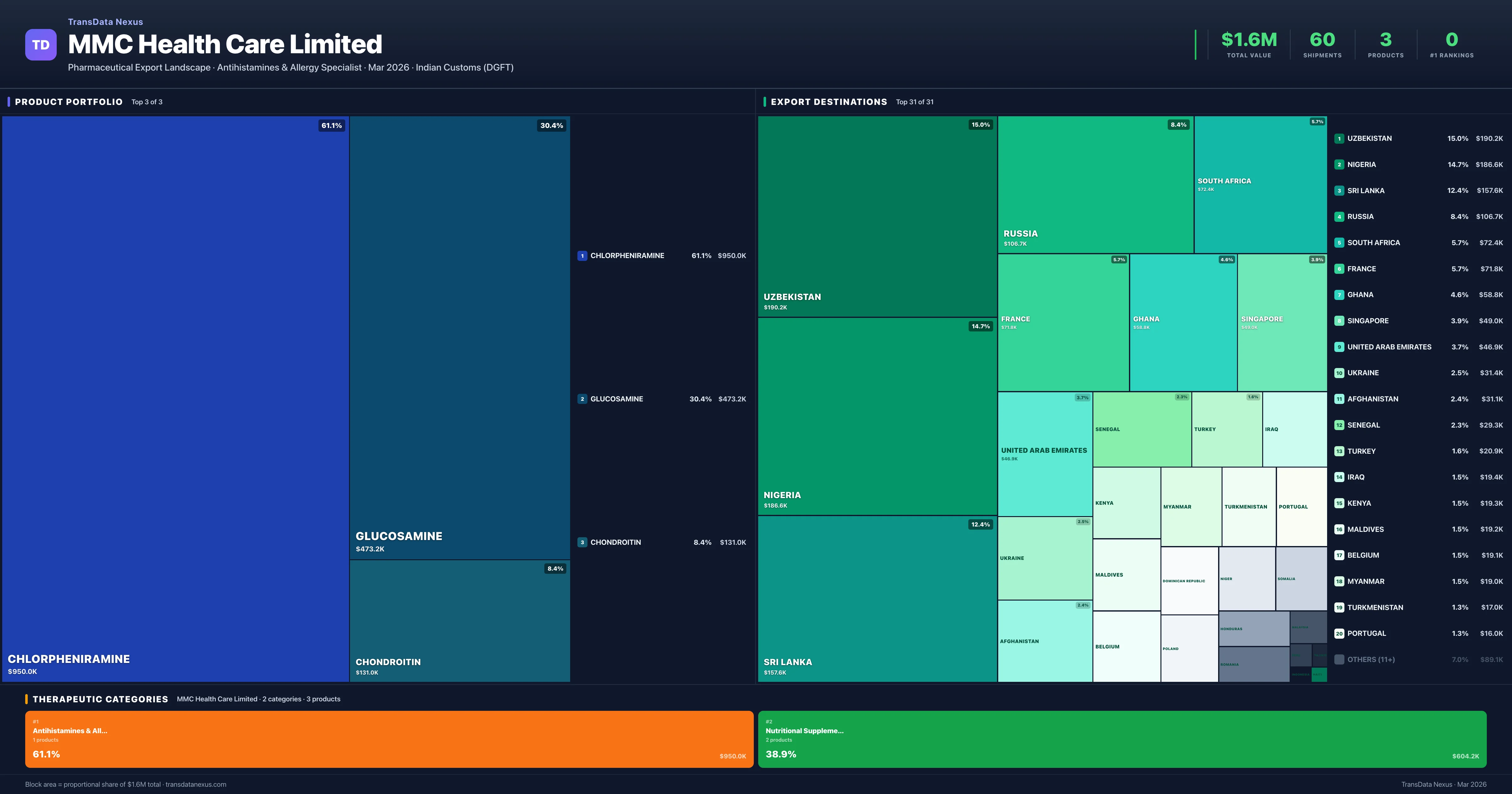 MMC Health Care Limited is an Indian pharmaceutical exporter with a total trade value of $1.6M across 3 products in 2 therapeutic categories. Based on 60 verified export shipments from Indian Customs (DGFT) records, the company actively competes across multiple product segments. Top exports include Chlorpheniramine ($950.0K), Glucosamine ($473.2K), Chondroitin ($131.0K).