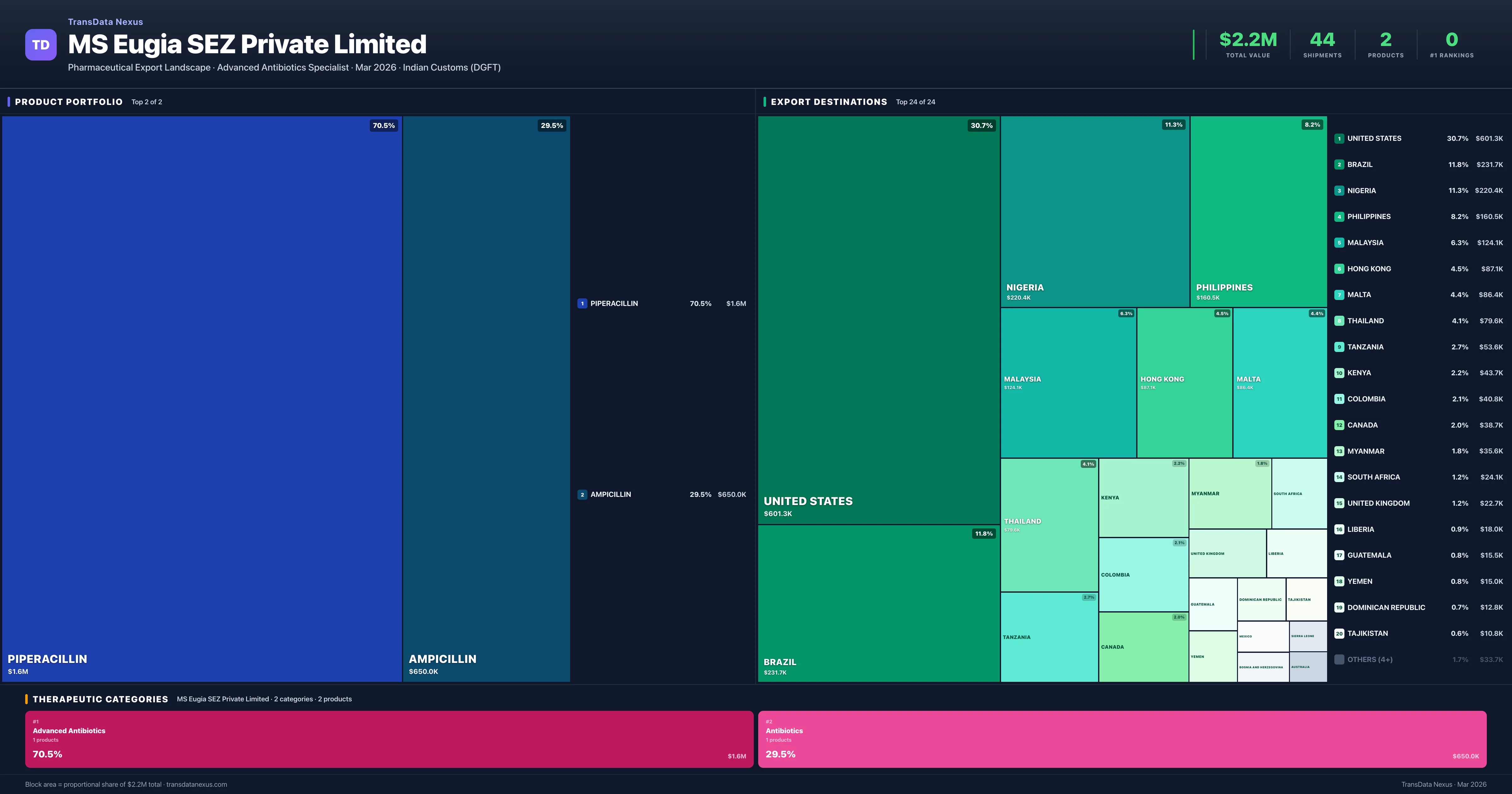 MS Eugia SEZ Private Limited is an Indian pharmaceutical exporter with a total trade value of $2.2M across 2 products in 2 therapeutic categories. Based on 44 verified export shipments from Indian Customs (DGFT) records, the company actively competes across multiple product segments. Top exports include Piperacillin ($1.6M), Ampicillin ($650.0K), .