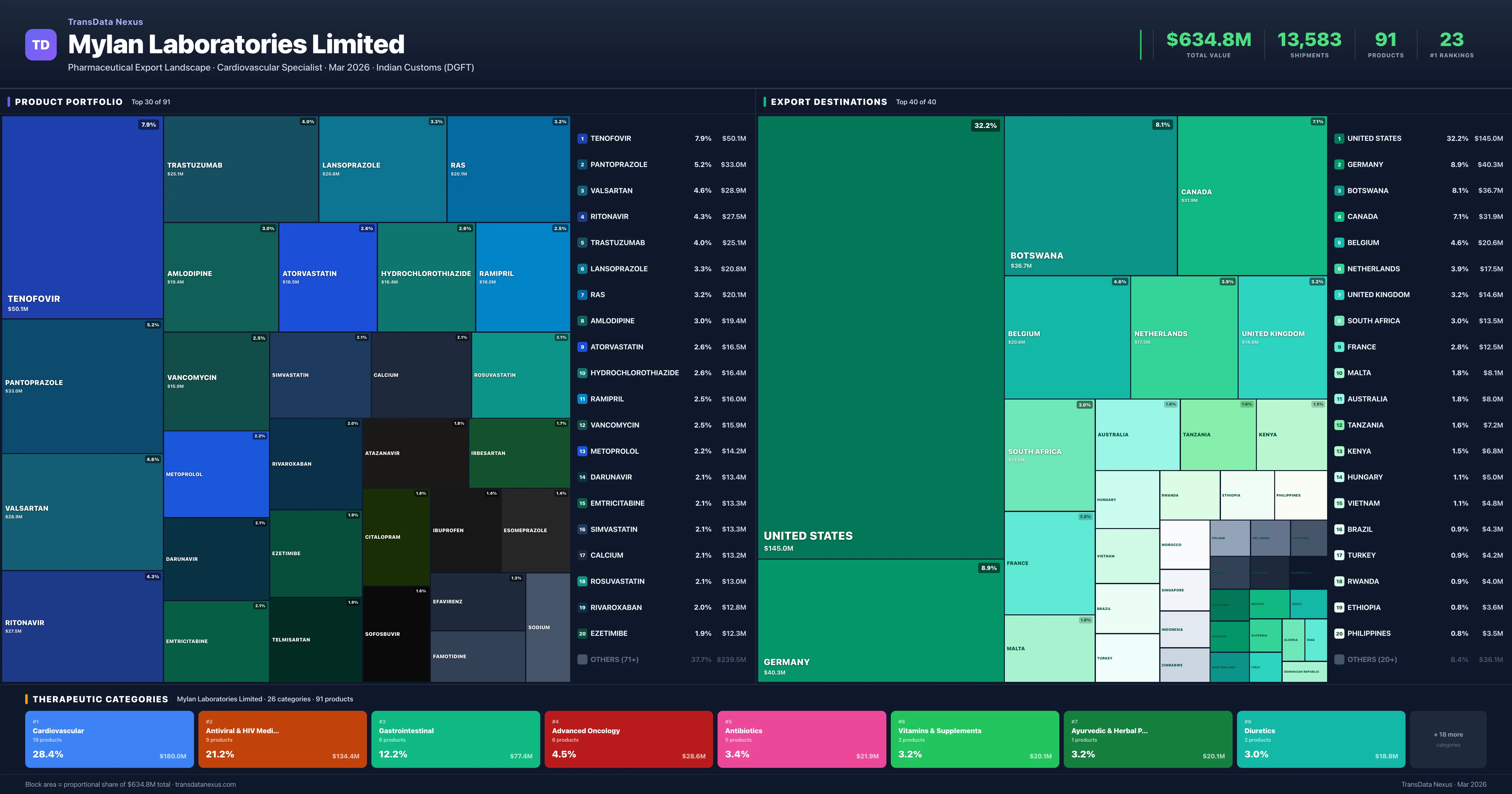 Mylan Laboratories Limited is an Indian pharmaceutical exporter with a total trade value of $634.8M across 91 products in 26 therapeutic categories. Based on 13,583 verified export shipments from Indian Customs (DGFT) records, Mylan Laboratories Limited is the #1 Indian exporter in 23 products including Pantoprazole, Valsartan, Trastuzumab. Top exports include Tenofovir ($50.1M), Pantoprazole ($33.0M), Valsartan ($28.9M).