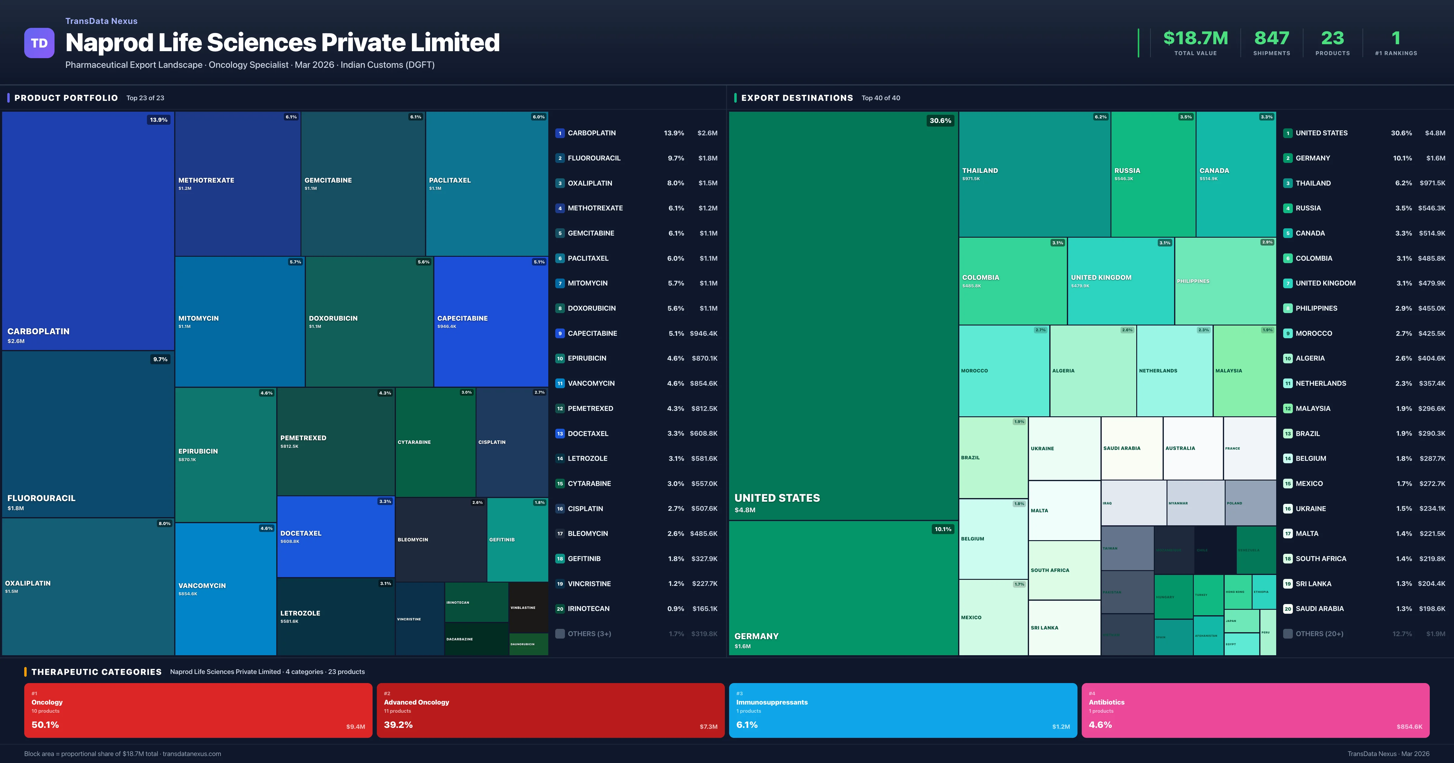 Naprod Life Sciences Private Limited is an Indian pharmaceutical exporter with a total trade value of $18.7M across 23 products in 4 therapeutic categories. Based on 847 verified export shipments from Indian Customs (DGFT) records, Naprod Life Sciences Private Limited is the #1 Indian exporter in 1 product including Vinblastine. Top exports include Carboplatin ($2.6M), Fluorouracil ($1.8M), Oxaliplatin ($1.5M).