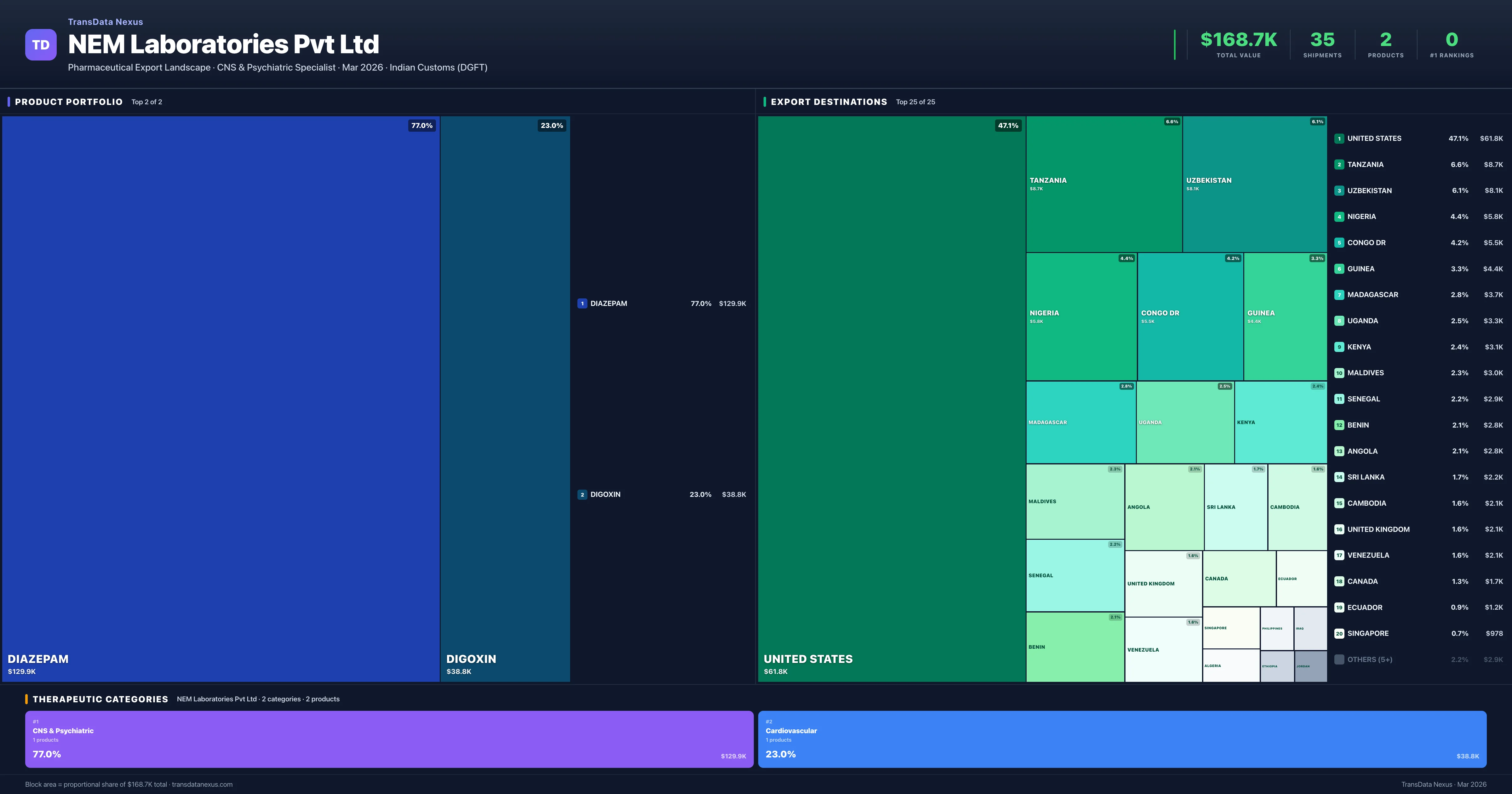 NEM Laboratories Pvt Ltd is an Indian pharmaceutical exporter with a total trade value of $168.7K across 2 products in 2 therapeutic categories. Based on 35 verified export shipments from Indian Customs (DGFT) records, the company actively competes across multiple product segments. Top exports include Diazepam ($129.9K), Digoxin ($38.8K), .