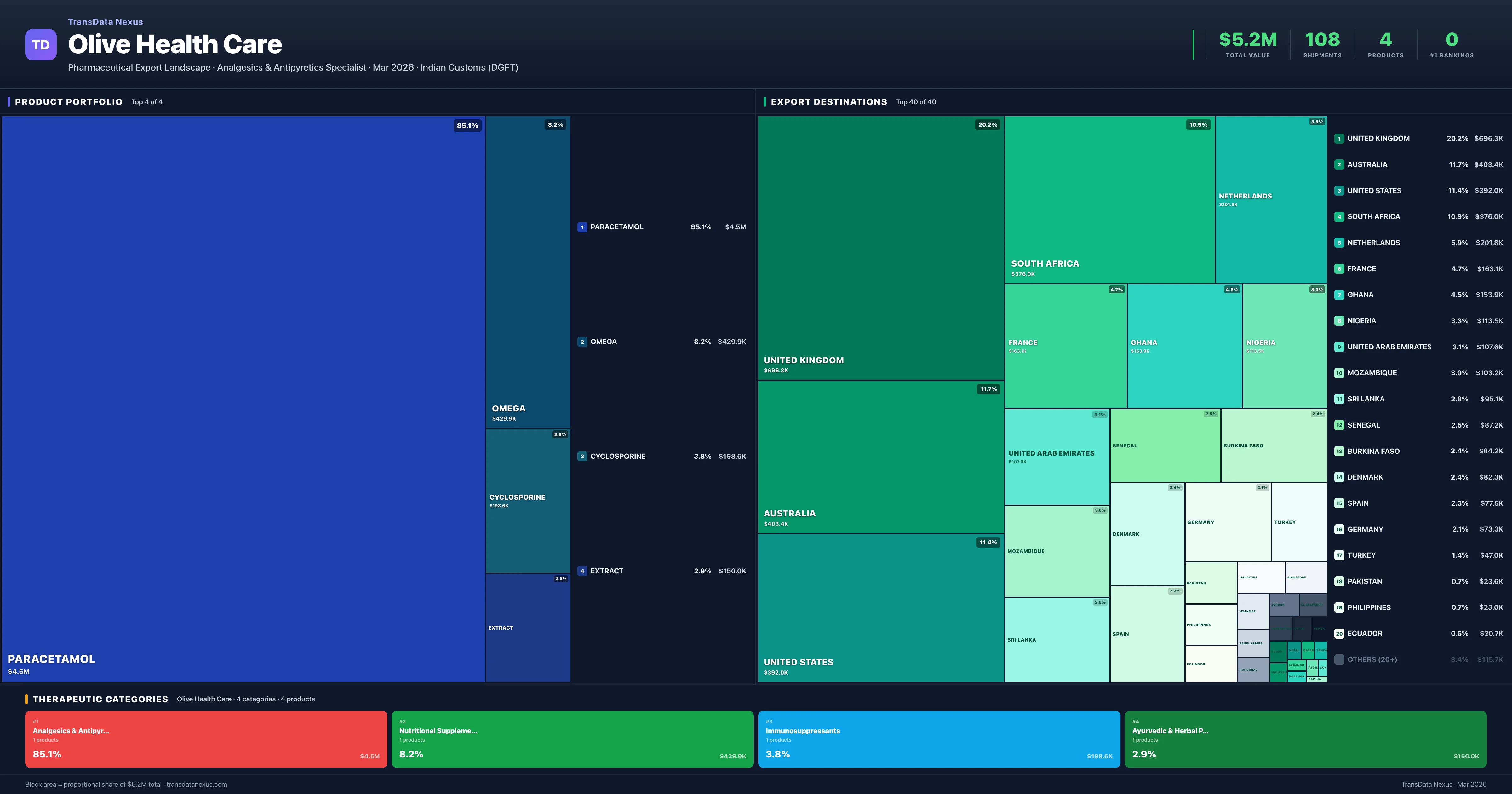 Olive Health Care exports 4 pharmaceutical products across 4 therapeutic categories. The top exports are Paracetamol ($4.5M), Omega ($429.9K), Cyclosporine ($198.6K), Extract ($150.0K). Total export value is $5.2M.