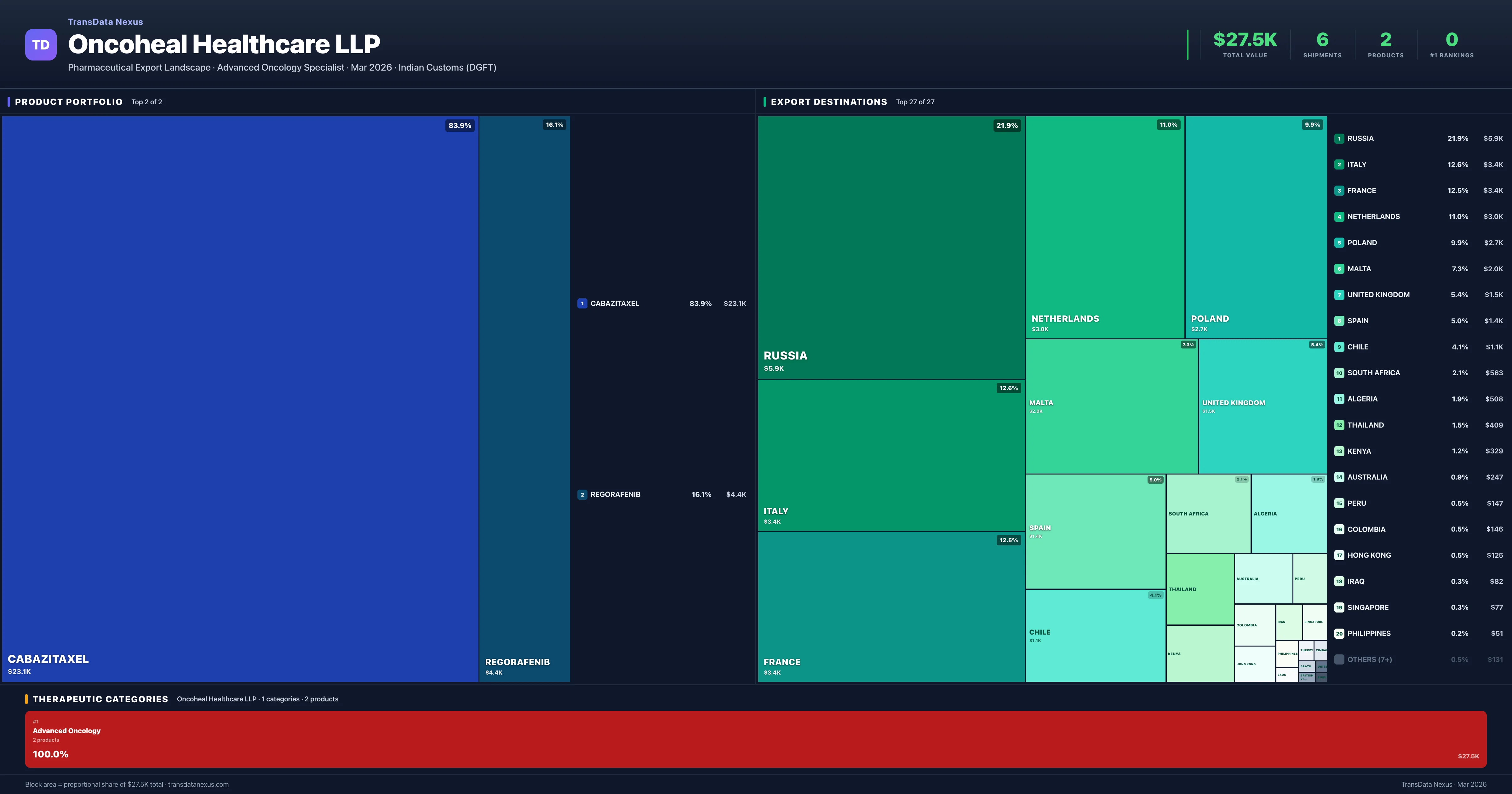 Oncoheal Healthcare LLP is an Indian pharmaceutical exporter with a total trade value of $27.5K across 2 products in 1 therapeutic categories. Based on 6 verified export shipments from Indian Customs (DGFT) records, the company actively competes across multiple product segments. Top exports include Cabazitaxel ($23.1K), Regorafenib ($4.4K), .