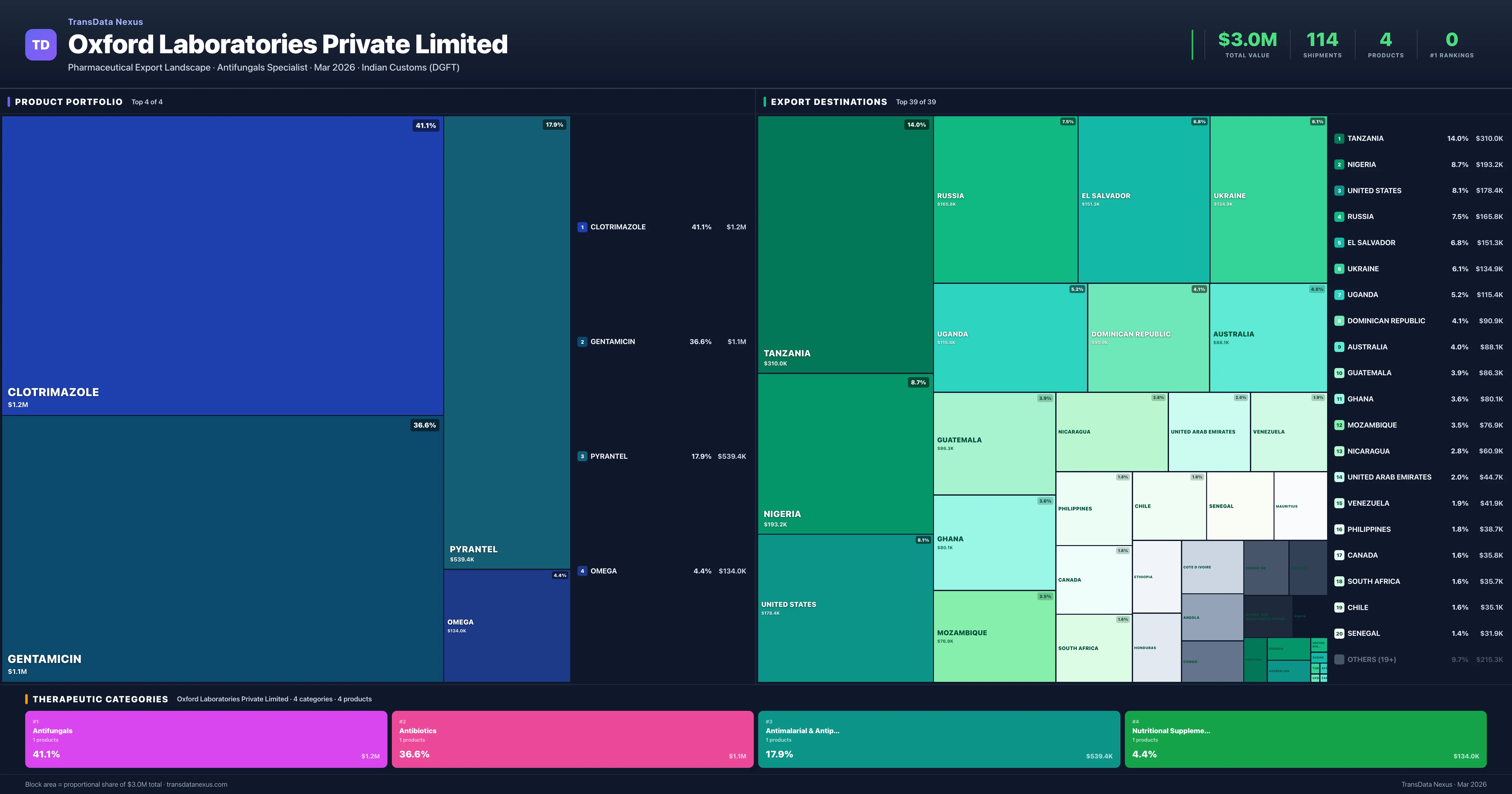 Oxford Laboratories Private Limited exports 4 pharmaceutical products across 4 therapeutic categories. The top exports are Clotrimazole ($1.2M), Gentamicin ($1.1M), Pyrantel ($539.4K), Omega ($134.0K). Total export value is $3.0M.