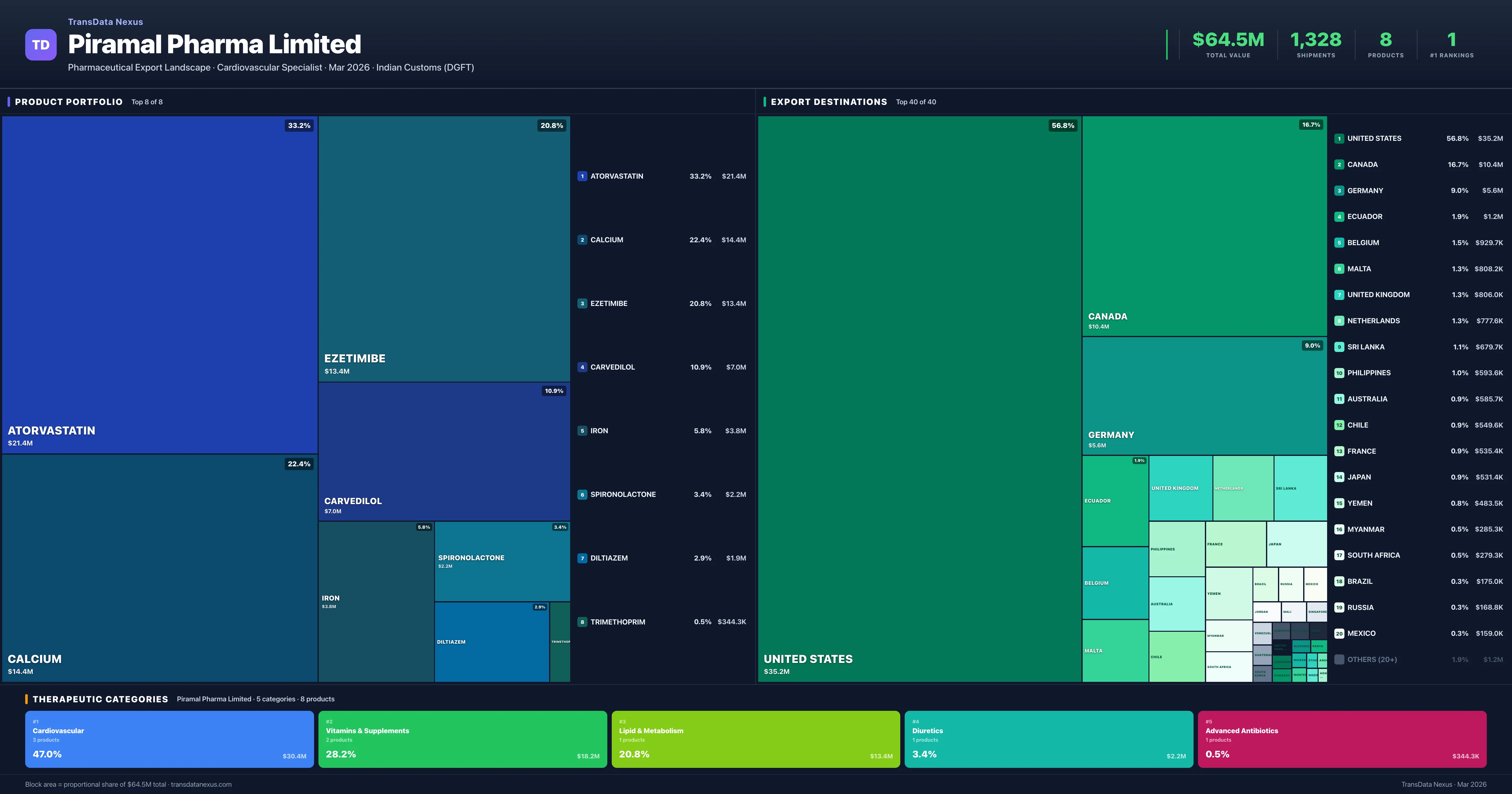 Piramal Pharma Limited is an Indian pharmaceutical exporter with a total trade value of $64.5M across 8 products in 5 therapeutic categories. Based on 1,328 verified export shipments from Indian Customs (DGFT) records, Piramal Pharma Limited is the #1 Indian exporter in 1 product including Ezetimibe. Top exports include Atorvastatin ($21.4M), Calcium ($14.4M), Ezetimibe ($13.4M).