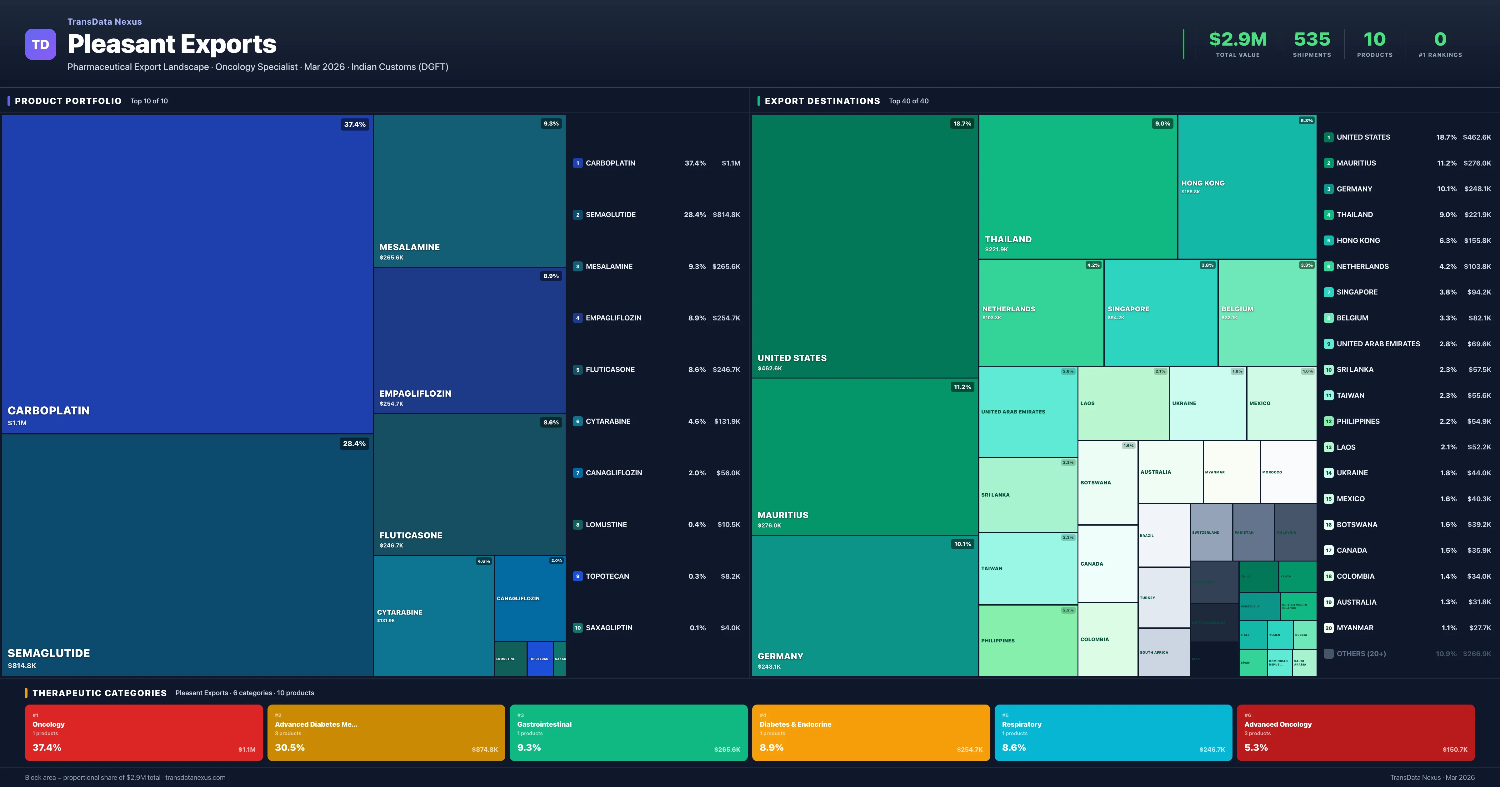 Pleasant Exports is an Indian pharmaceutical exporter with a total trade value of $2.9M across 10 products in 6 therapeutic categories. Based on 535 verified export shipments from Indian Customs (DGFT) records, the company actively competes across multiple product segments. Top exports include Carboplatin ($1.1M), Semaglutide ($814.8K), Mesalamine ($265.6K).