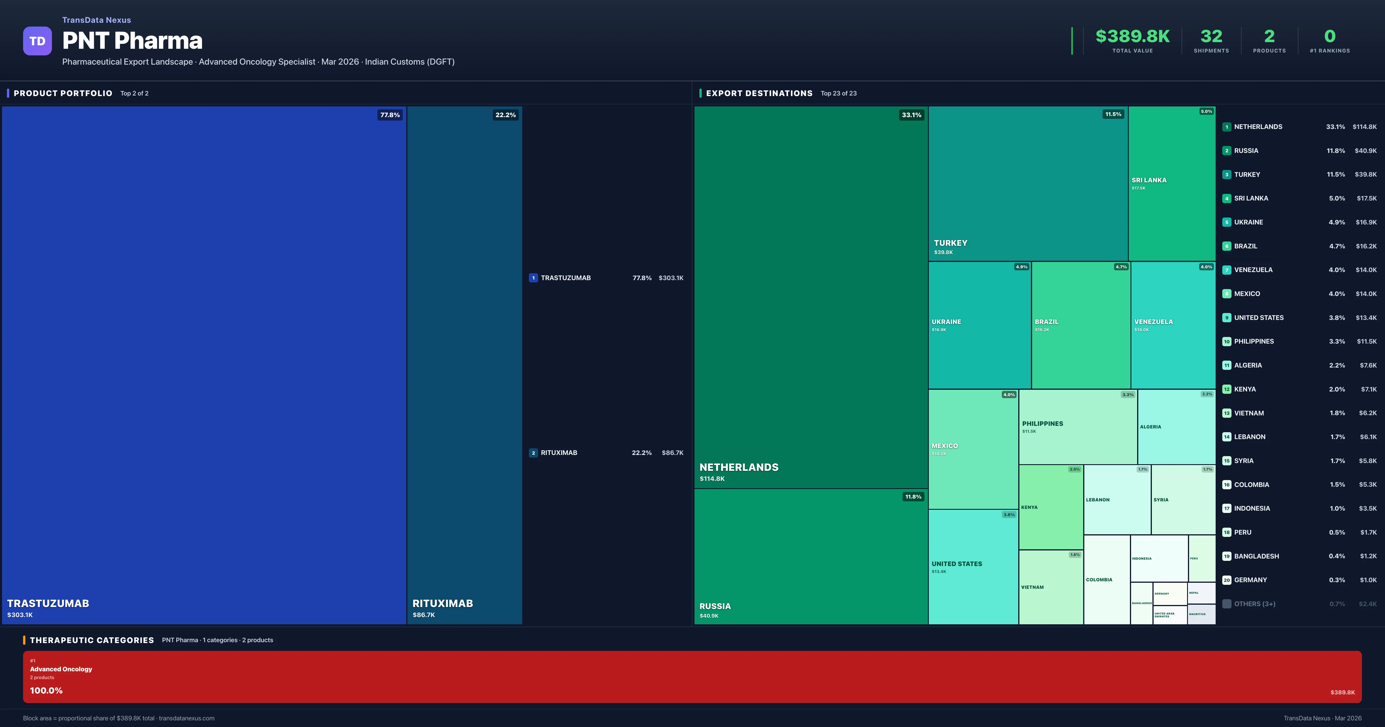 PNT Pharma is an Indian pharmaceutical exporter with a total trade value of $389.8K across 2 products in 1 therapeutic categories. Based on 32 verified export shipments from Indian Customs (DGFT) records, the company actively competes across multiple product segments. Top exports include Trastuzumab ($303.1K), Rituximab ($86.7K), .