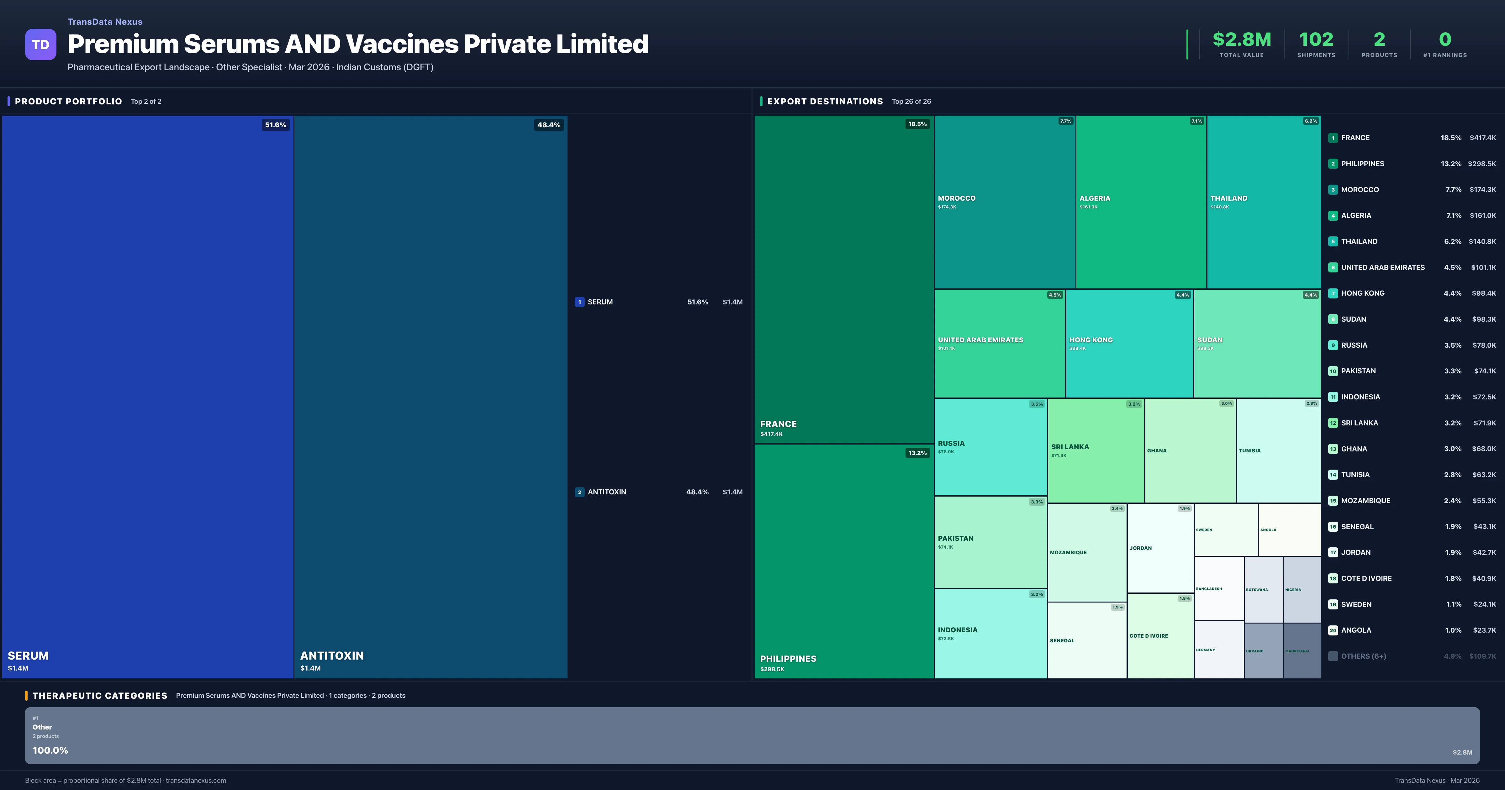 Premium Serums AND Vaccines Private Limited's total pharmaceutical export value is $2.8M, based on 102 verified shipments recorded in Indian Customs (DGFT) data.
