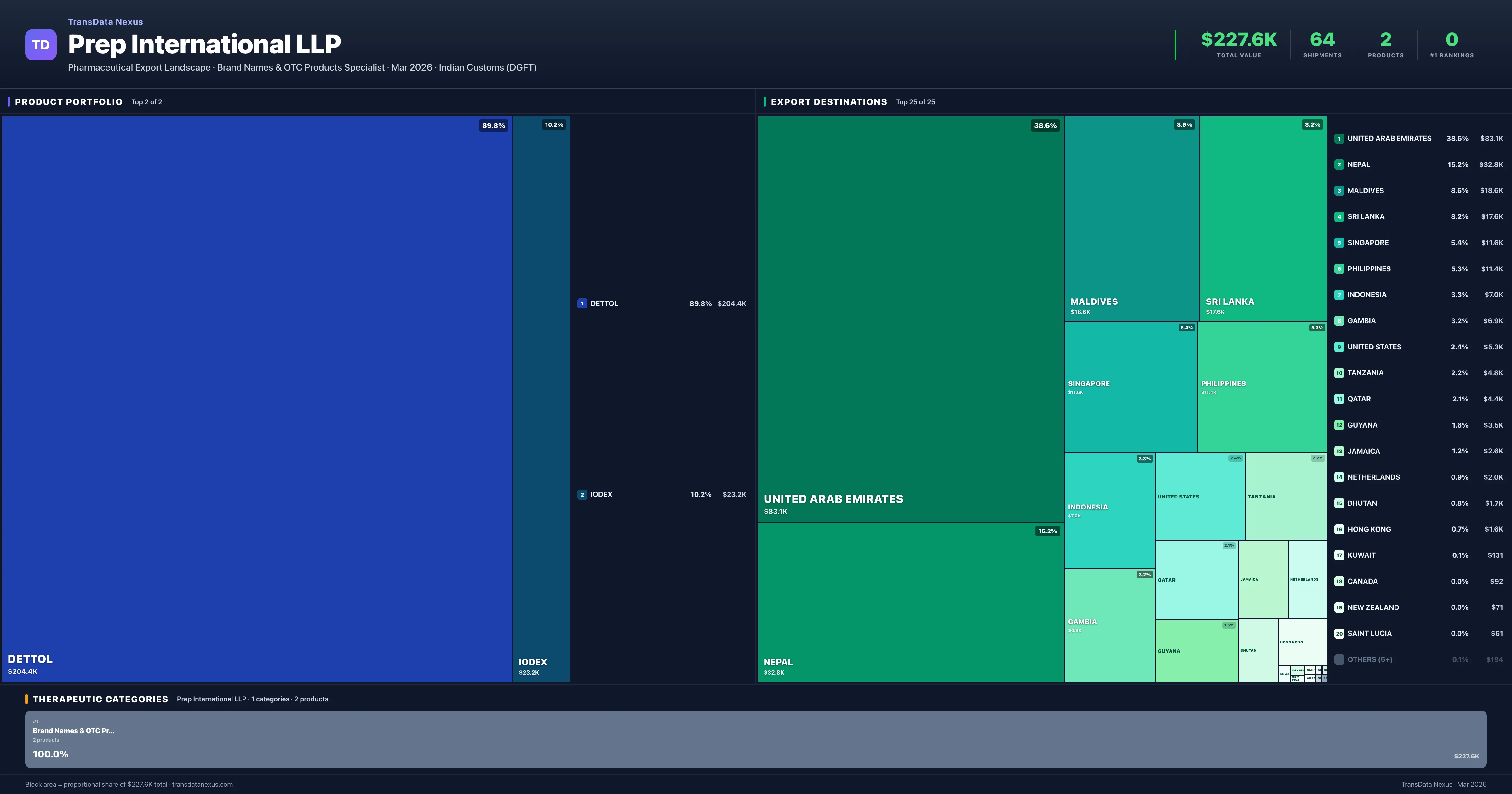 Prep International LLP is an Indian pharmaceutical exporter with a total trade value of $227.6K across 2 products in 1 therapeutic categories. Based on 64 verified export shipments from Indian Customs (DGFT) records, the company actively competes across multiple product segments. Top exports include Dettol ($204.4K), Iodex ($23.2K), .