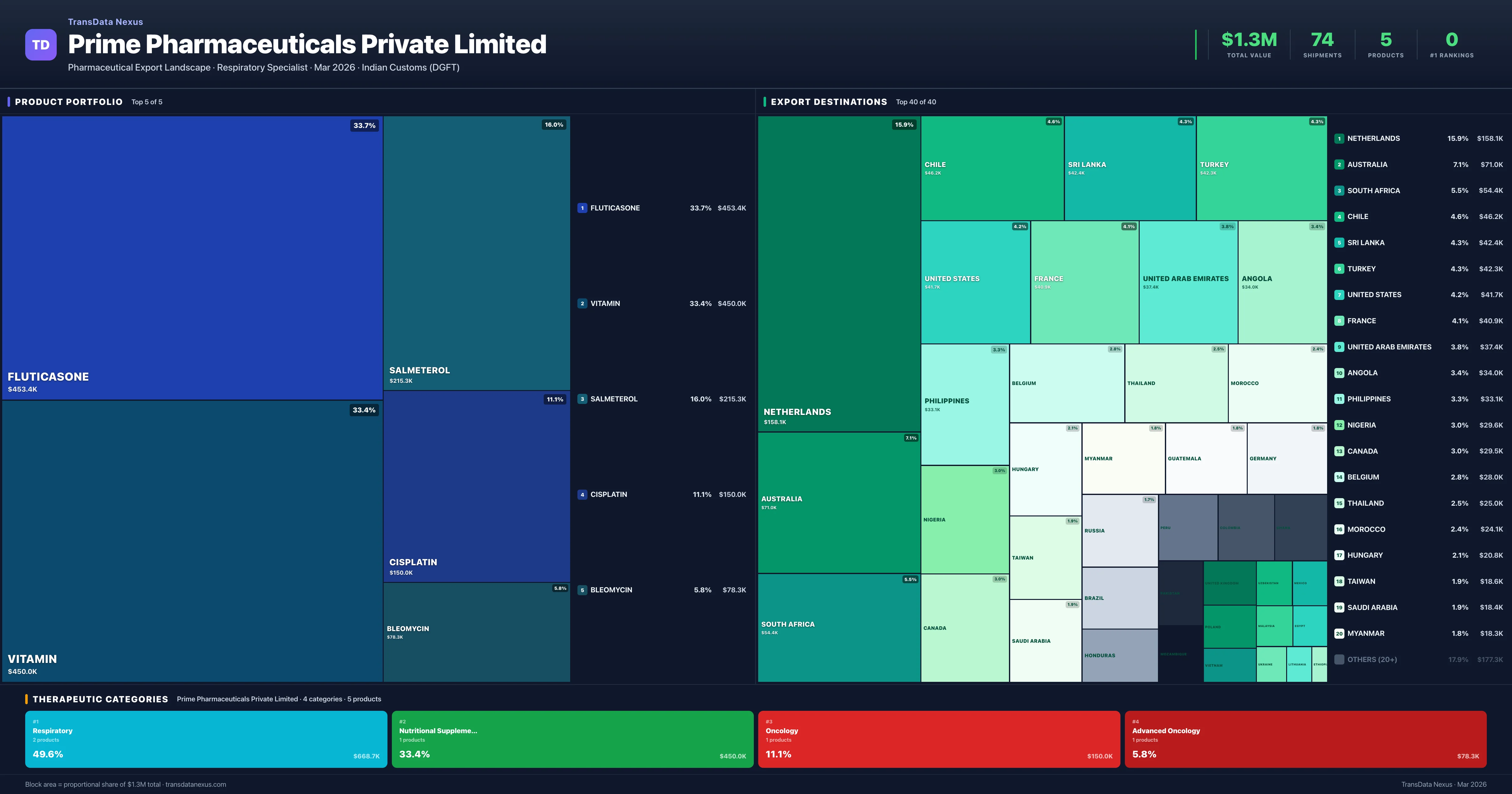 Prime Pharmaceuticals Private Limited is an Indian pharmaceutical exporter with a total trade value of $1.3M across 5 products in 4 therapeutic categories. Based on 74 verified export shipments from Indian Customs (DGFT) records, the company actively competes across multiple product segments. Top exports include Fluticasone ($453.4K), Vitamin ($450.0K), Salmeterol ($215.3K).