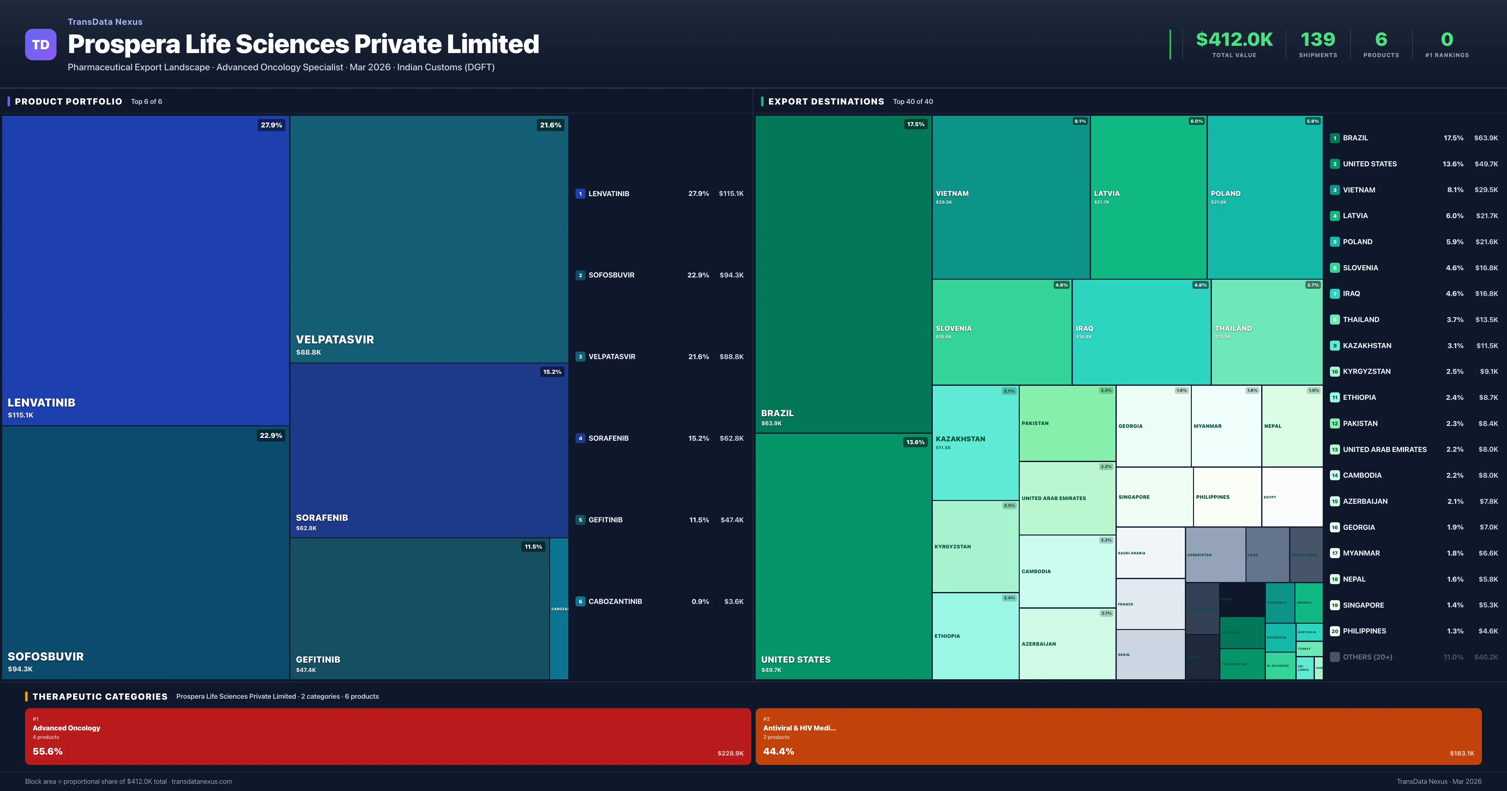 Prospera Life Sciences Private Limited's export activities, as reported by TransData Nexus, indicate a total export value of $412,000 USD across 139 shipments from 2022 to 2026. The company's product portfolio includes six finished pharmaceutical formulations across two therapeutic categories: Advanced Oncology (55.6%) and Antiviral & HIV Medications (44.4%). The top five exported products are: